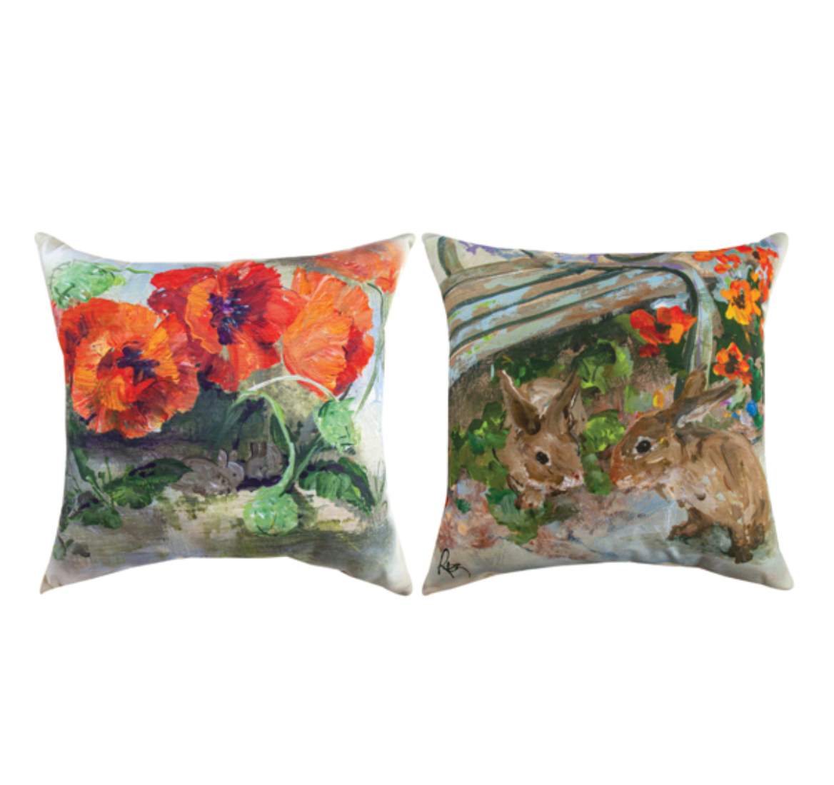 This outdoor throw pillow features the charming 2 Bunnies design printed on durable Climaweave polyester fabric. The 18-inch square size is ideal for adding soft comfort and seasonal style to porches, patios, or garden seating. Weather-resistant and easy to maintain, it’s built to last through outdoor use while keeping its vibrant design.