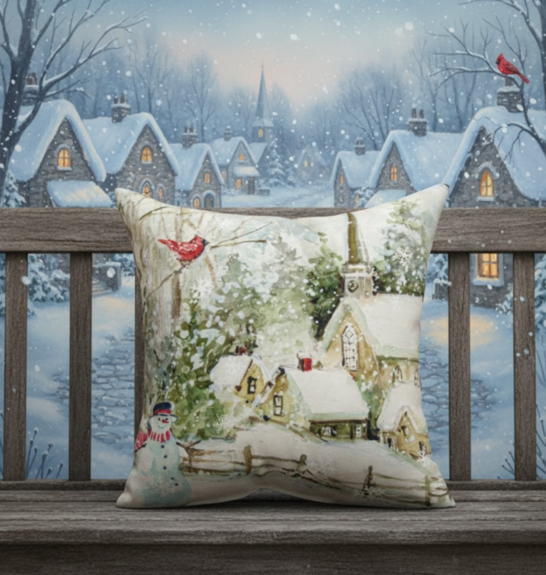 SKU - MWWSLSCCAOutdoor Pillow - Snow Church Cardinal Design - 18" Climaweave Polyester by Manual Woodworkers