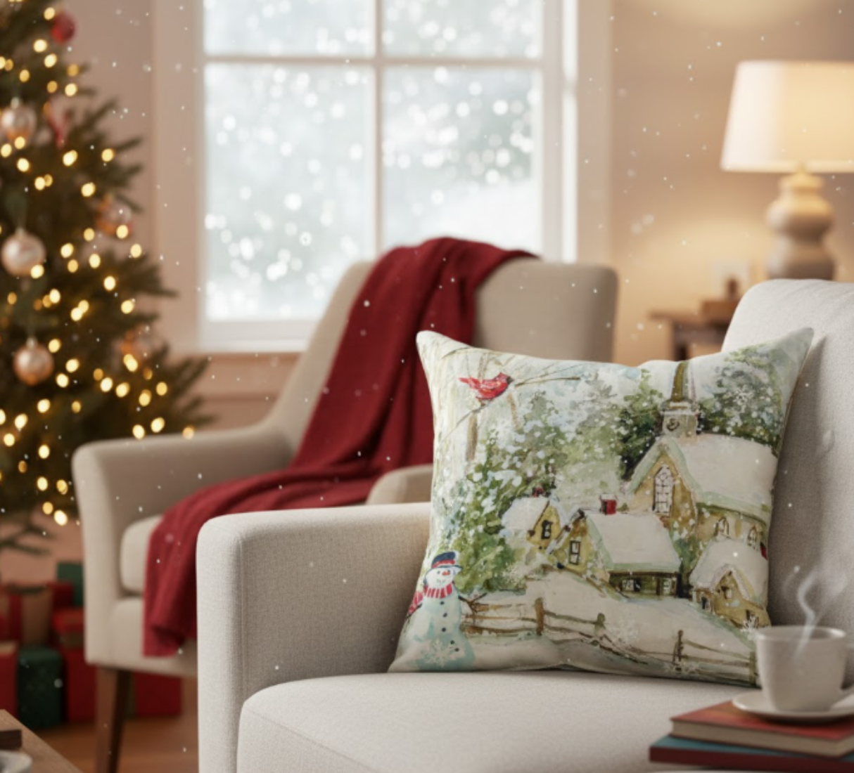 This outdoor throw pillow features a serene Snow Church Cardinal design printed on durable Climaweave polyester. Sized at 18 inches square, it’s ideal for adding seasonal charm and comfort to outdoor spaces like porches, patios, or garden benches. The weather-resistant fabric stands up to moisture and sun while maintaining its color and softness.