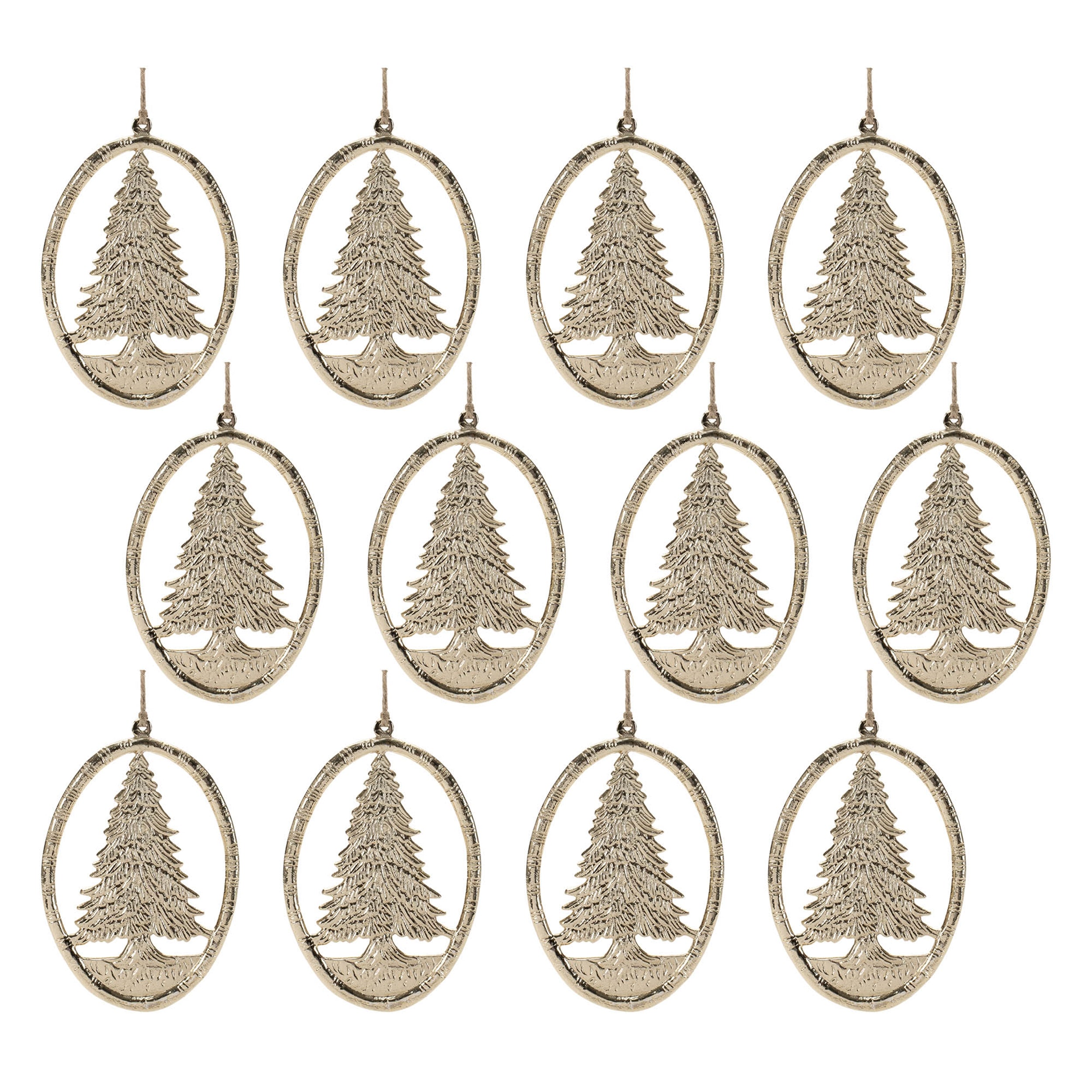 Add timeless charm to your holiday décor with this Set of 12 Etched Metal Pine Tree Ornaments. Measuring 6"H, each ornament is crafted from durable gold-toned aluminum and features an elegant oval shape with an intricately etched woodland pine tree design. Rustic detailing and a soft metallic finish create a warm seasonal look that complements traditional, rustic, or modern Christmas trees. Each ornament includes a natural jute string hanger for easy display on trees, wreaths, or garlands. Ideal for creating a cohesive holiday theme, this coordinating ornament set also makes a thoughtful seasonal gift, bringing festive texture and refined style to holiday decorating year after year.