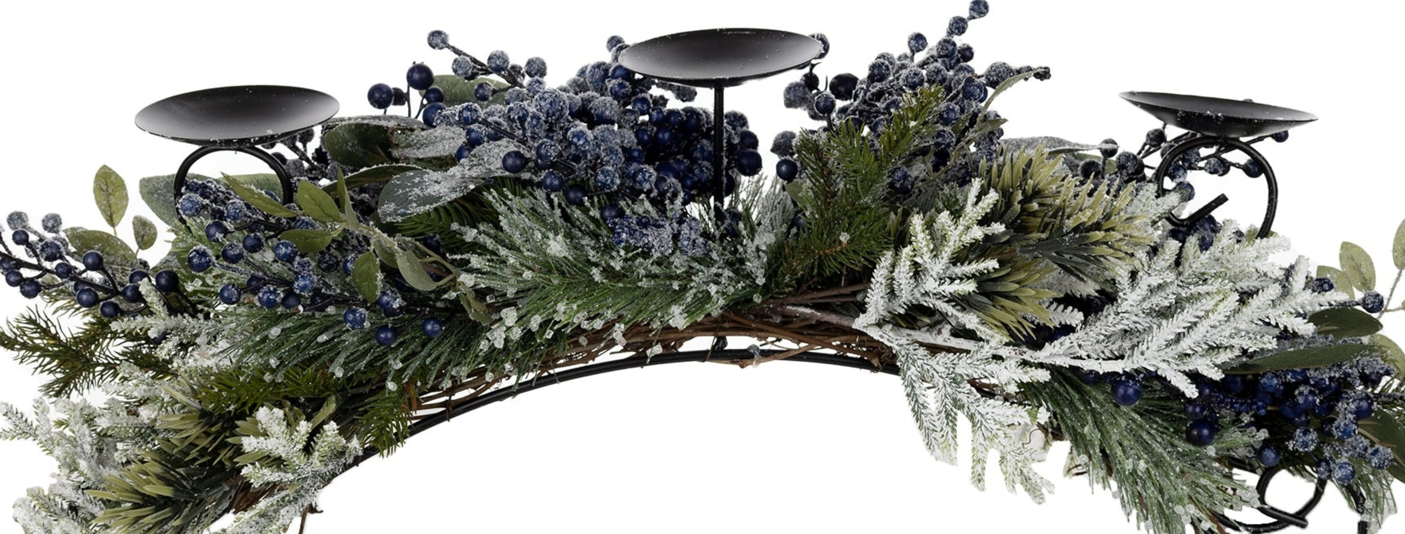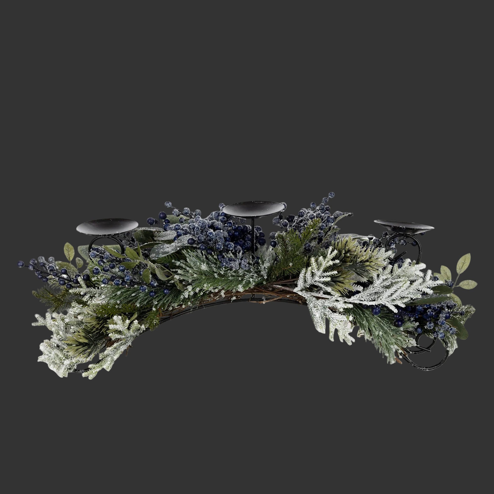 This pine centerpiece features a blend of plastic and foam greenery designed to bring a festive and seasonal touch to your home. Measuring 31 inches in length, 12 inches in width, and 11 inches in height, the arrangement includes frosted pine branches, blue and green accents, and three integrated candle holders sized for standard pillar candles, which are sold separately. The combination of colors and textures creates a winter inspired design suitable for dining tables, mantels, or holiday displays. Built with a durable metal base, this centerpiece is intended for indoor use and offers long lasting decorative appeal throughout the holiday season.