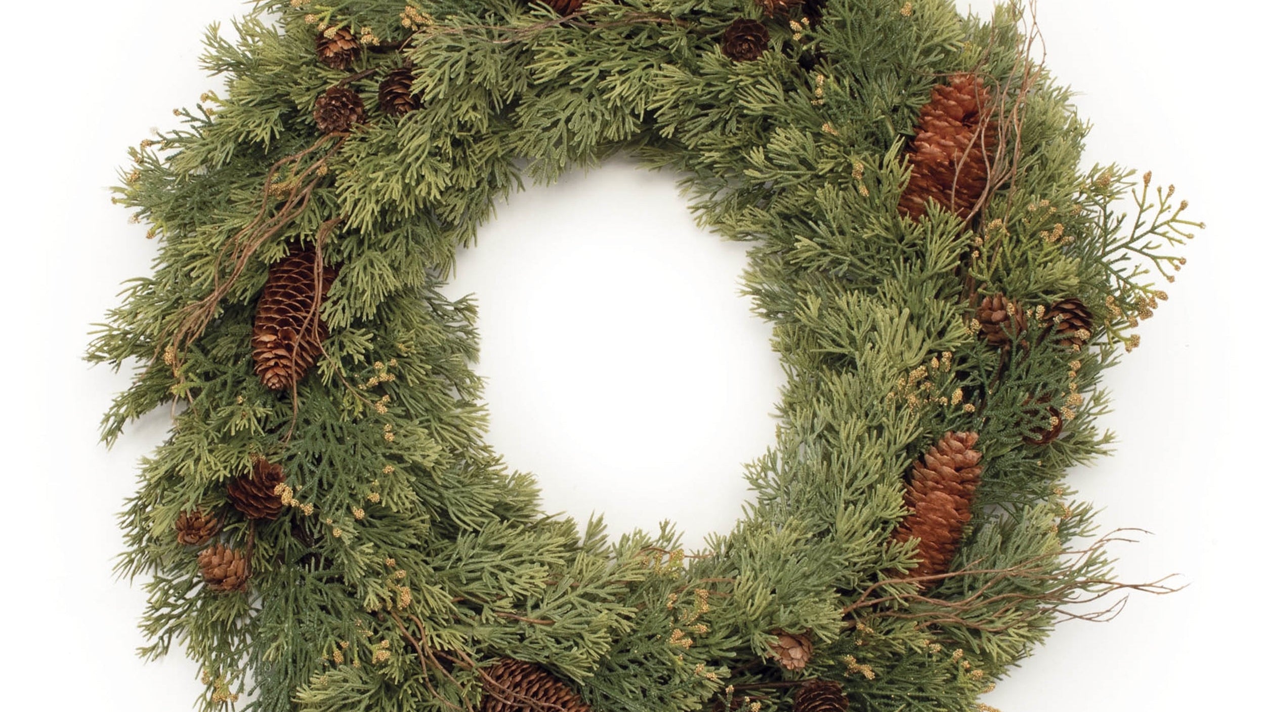 SKU - MEL-95923DSPine Wreath 5"H Plastic Twig Green Brown Farmhouse Holiday Decor