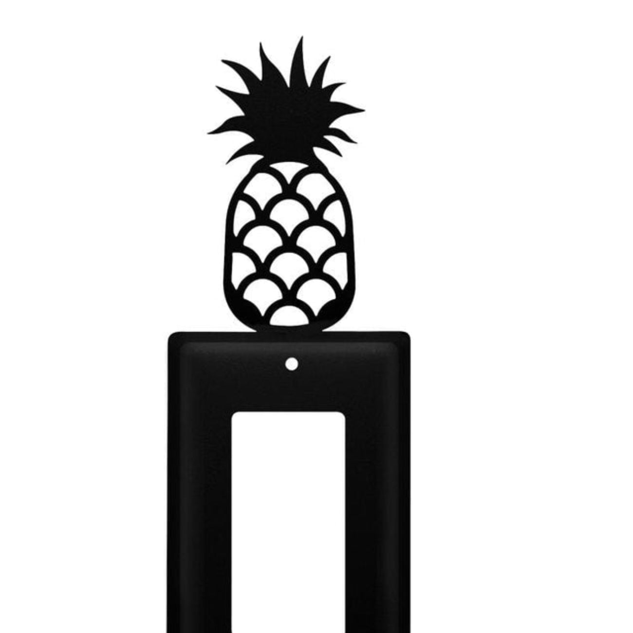 This single GFI wall cover features a pineapple wrought iron design that adds a welcoming tropical accent to kitchens, dining areas, and coastal style interiors. Crafted from durable metal, this decorative wall plate replaces standard GFI outlet covers while maintaining proper fit and reliable everyday function. The open silhouette design provides visual interest without overwhelming surrounding wall finishes. Designed for indoor residential use, it installs easily using standard outlet hardware and cleans with a dry or damp cloth. Ideal for tropical, coastal, and island inspired homes. Overall dimensions measure 2.75 Inch width, 0.17 Inch depth, and 8.13 Inch height for compatibility with standard single GFI outlets.