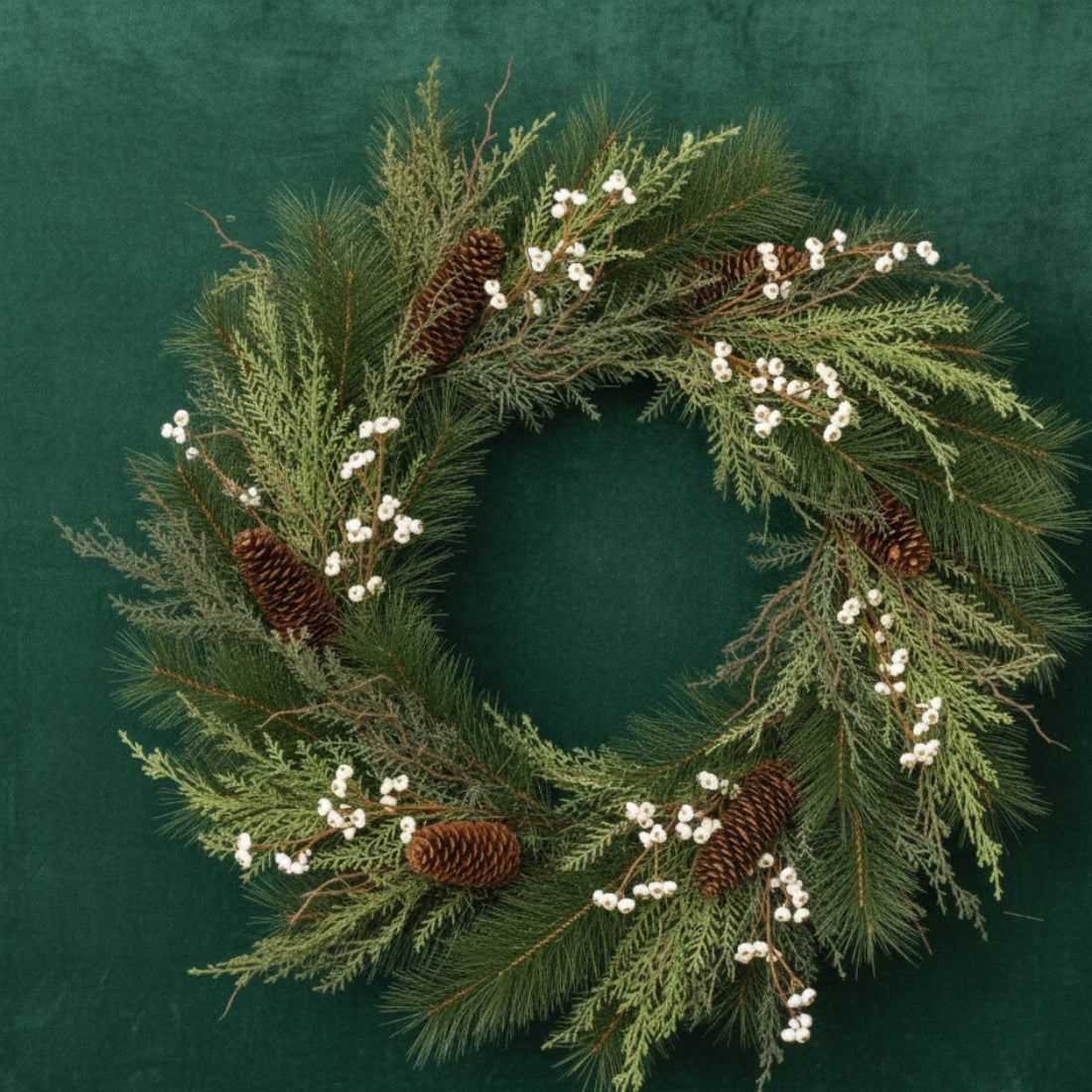 This pine wreath adds a warm, nature-inspired touch to your holiday décor. Measuring approximately 28 inches in diameter when fully fluffed, it features lush mixed pine foliage accented with natural pinecones and delicate tallow berry details for subtle seasonal contrast. The earthy green and brown tones create a timeless woodland look that complements both rustic and traditional décor styles. Wired branches allow for easy shaping and a full, dimensional display. Ideal for hanging on front doors, above mantels, or on feature walls, this wreath brings cozy charm and festive greenery to your home throughout the holiday season.