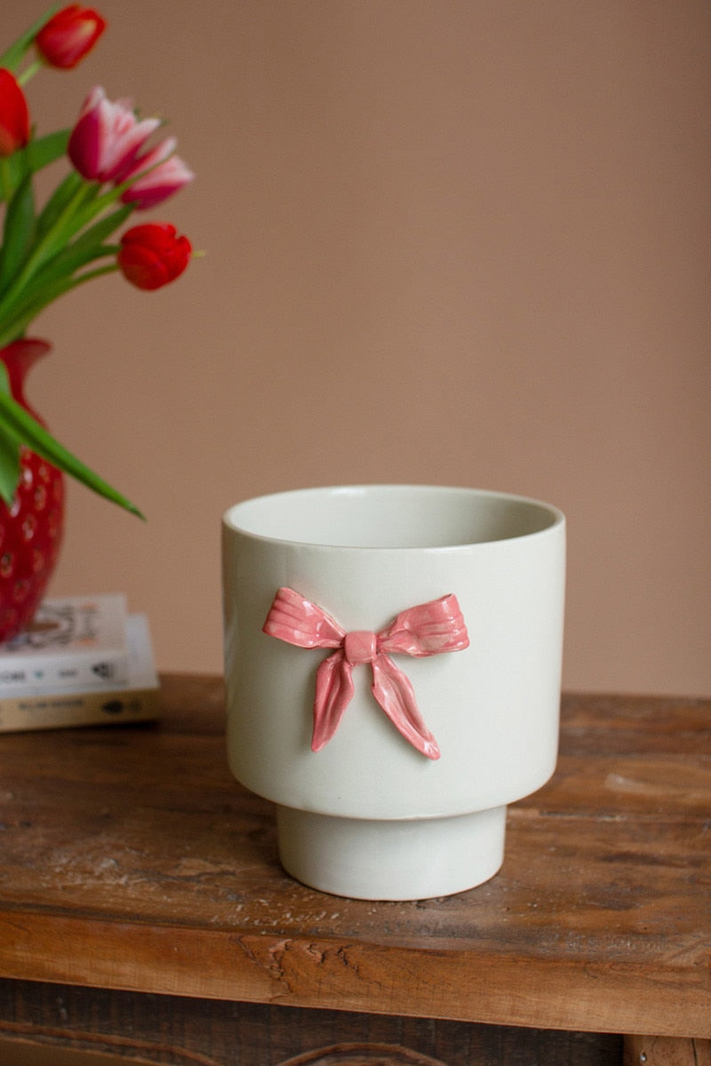 Planter – Decorative Ceramic – Pink Ribbon Detail – 6.5"Tall for Tabletop by Kalalou