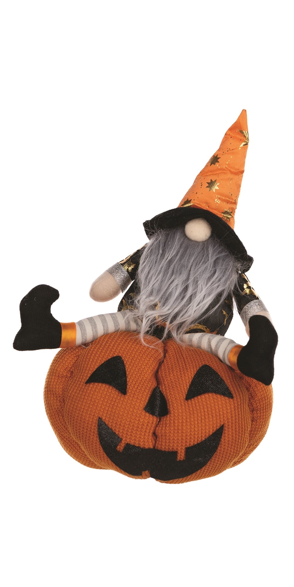 Plush Halloween Gnome on Pumpkin Set – 14"H – Fabric Orange Black – By Melrose