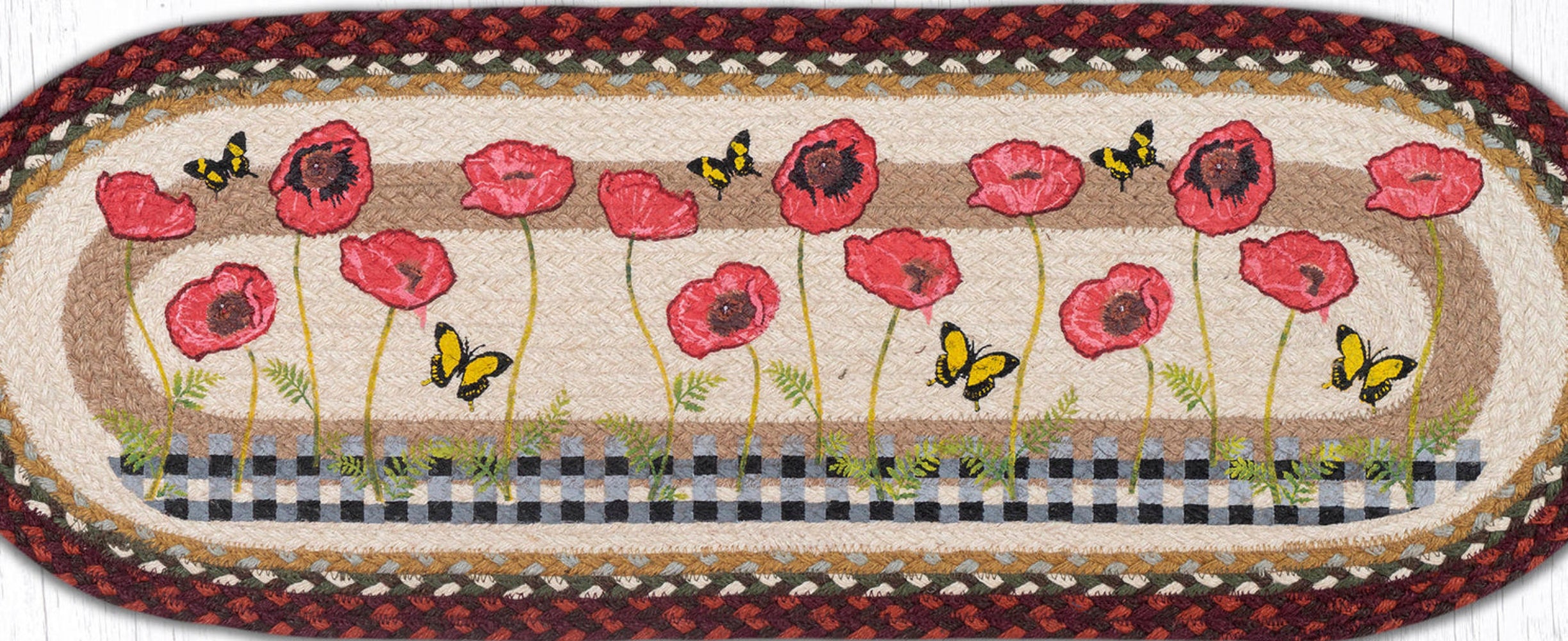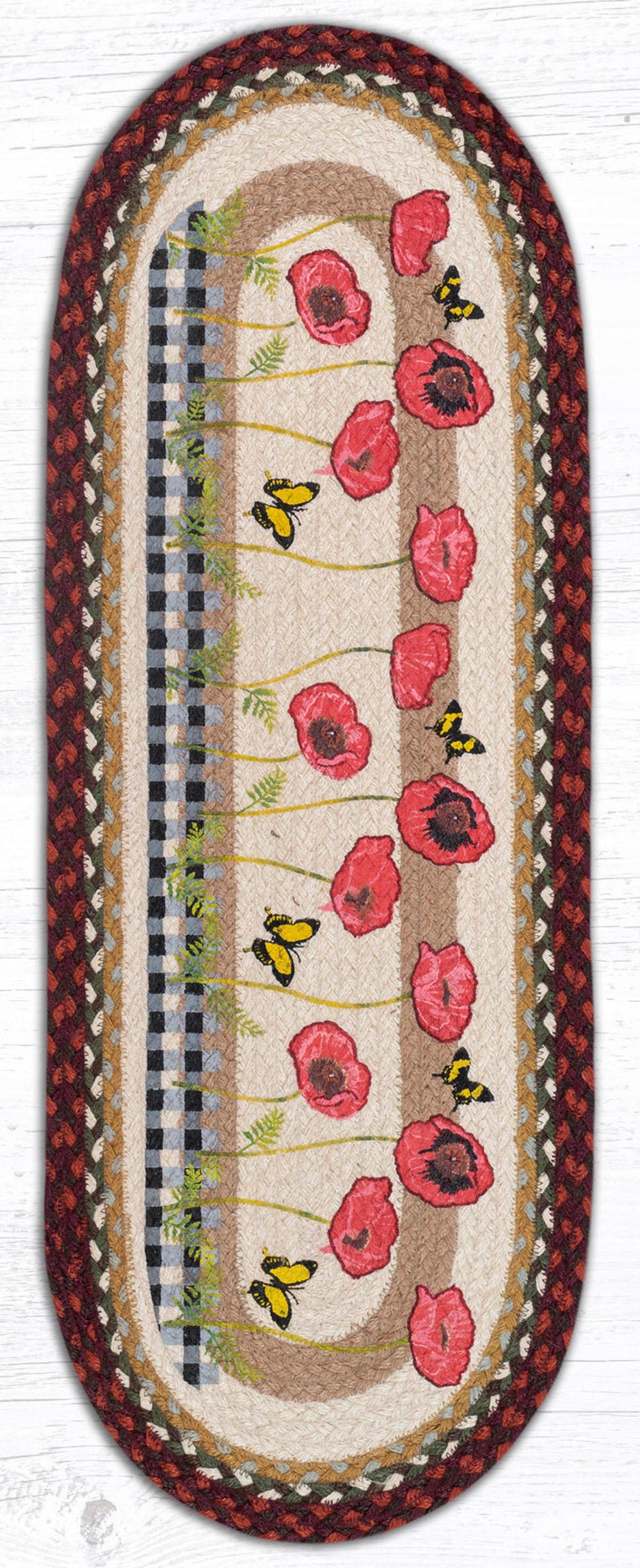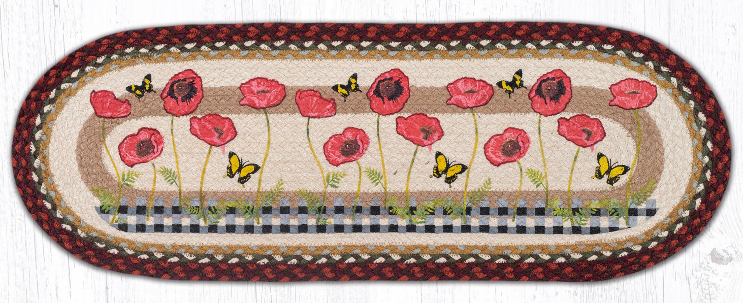 Poppies with Black Check Oval Table Runner – 13" x 36" Braided Jute Hand-Stenciled Runner For Indoor Decor by Earth Rugs