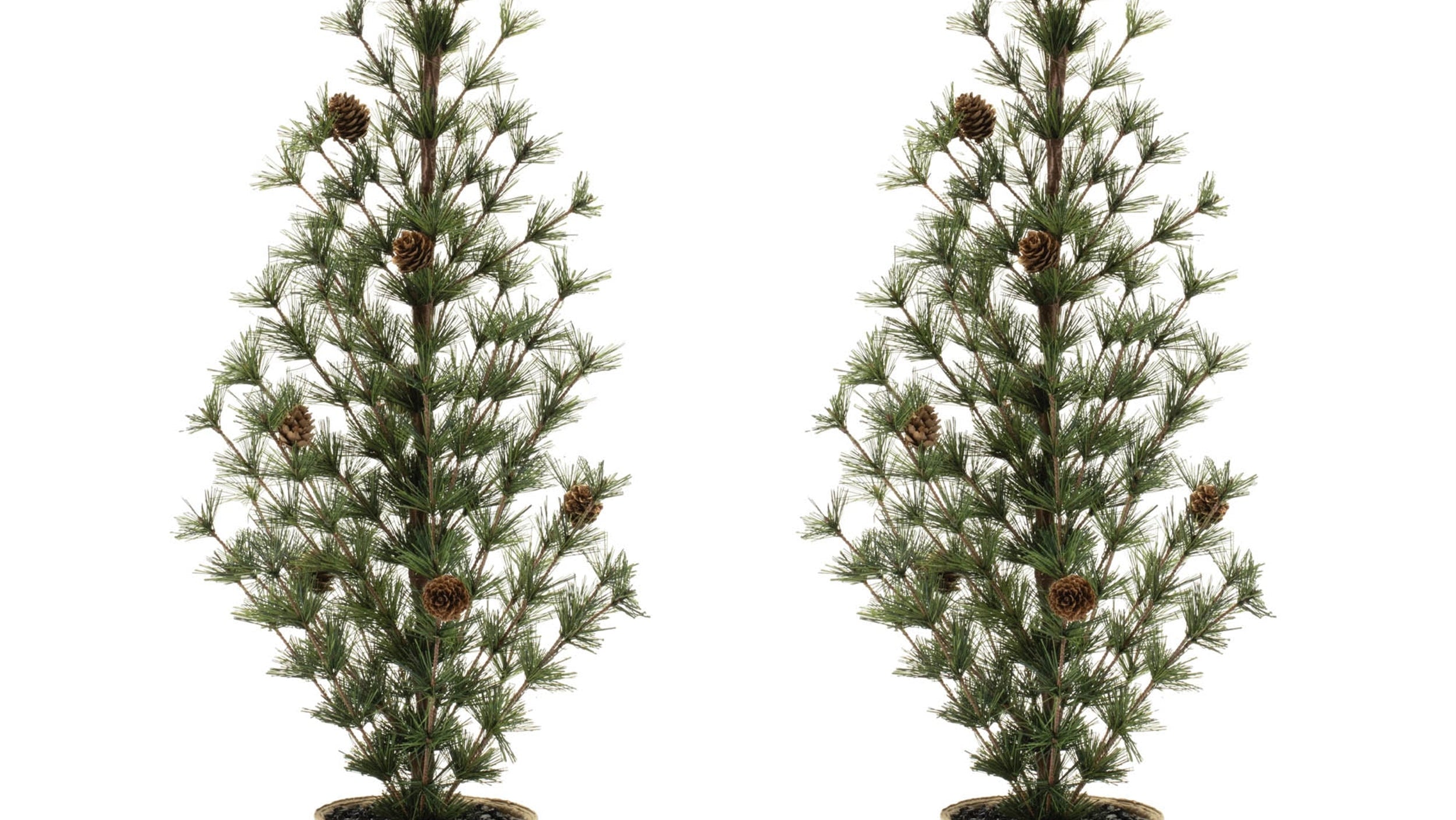 The potted mini pine tree set adds classic holiday greenery to indoor seasonal décor. This set of two artificial pine trees features lush green faux branches with wired construction for easy shaping and natural pinecone accents for an authentic look. Each tree is housed in a whitewashed planter base that complements farmhouse, rustic, and modern holiday styles. Ideal for flanking entryways, decorating mantels, or styling fireplace displays, these trees provide balanced symmetry and festive charm without maintenance. Crafted from plastic with iron support, they are designed for indoor use only. Each tree measures 13.5" W x 13.5" D x 31.5" H.