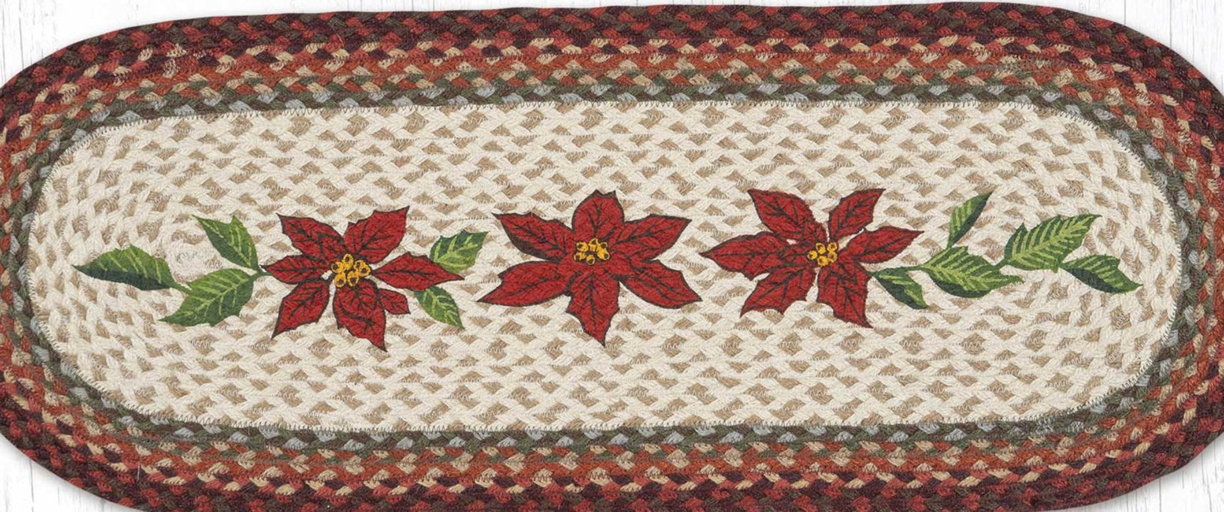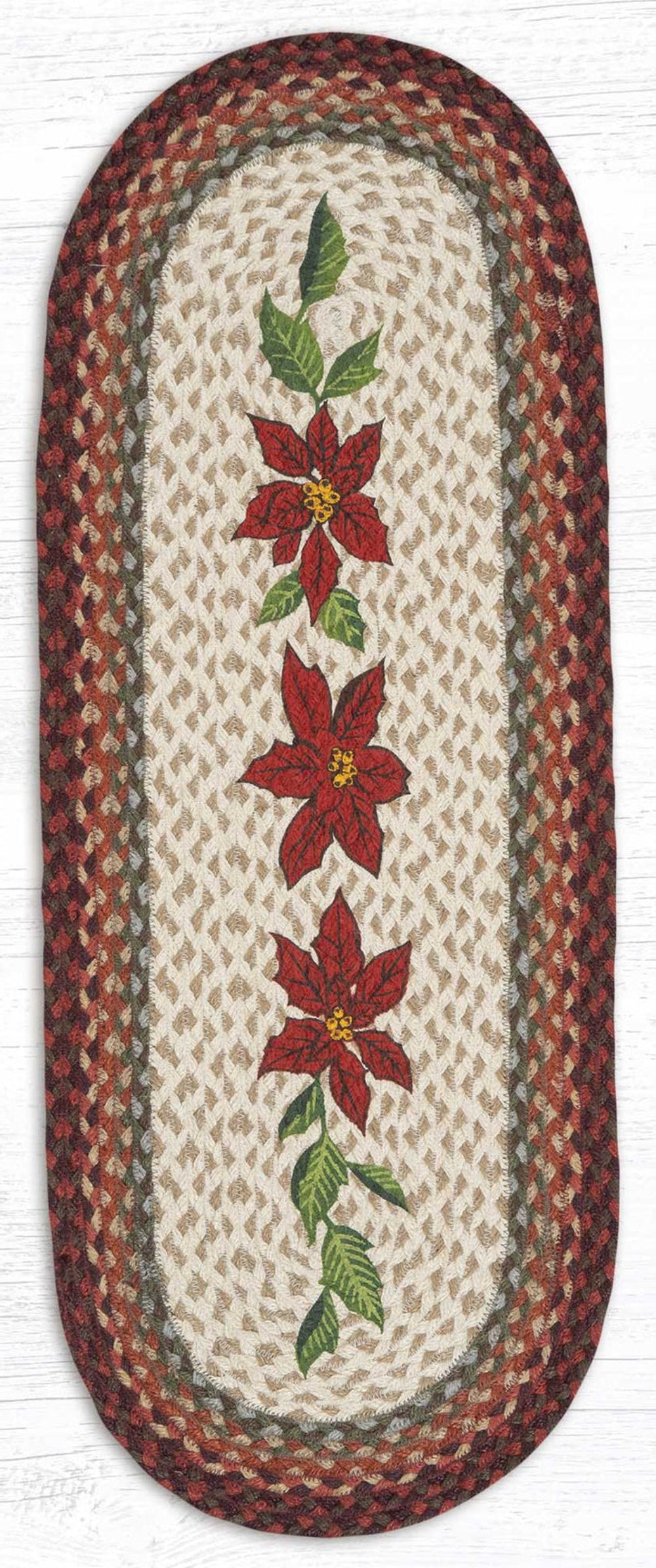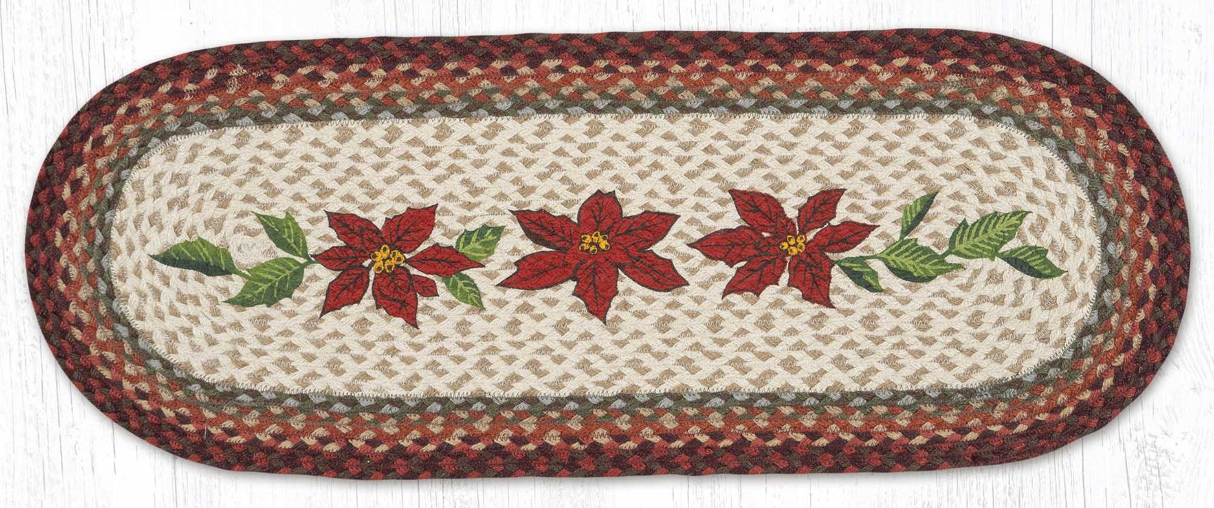 Primitive Poinsettia Oval Table Runner – 13" x 36" Braided Jute Hand-Stenciled Runner For Indoor Decor by Earth Rugs