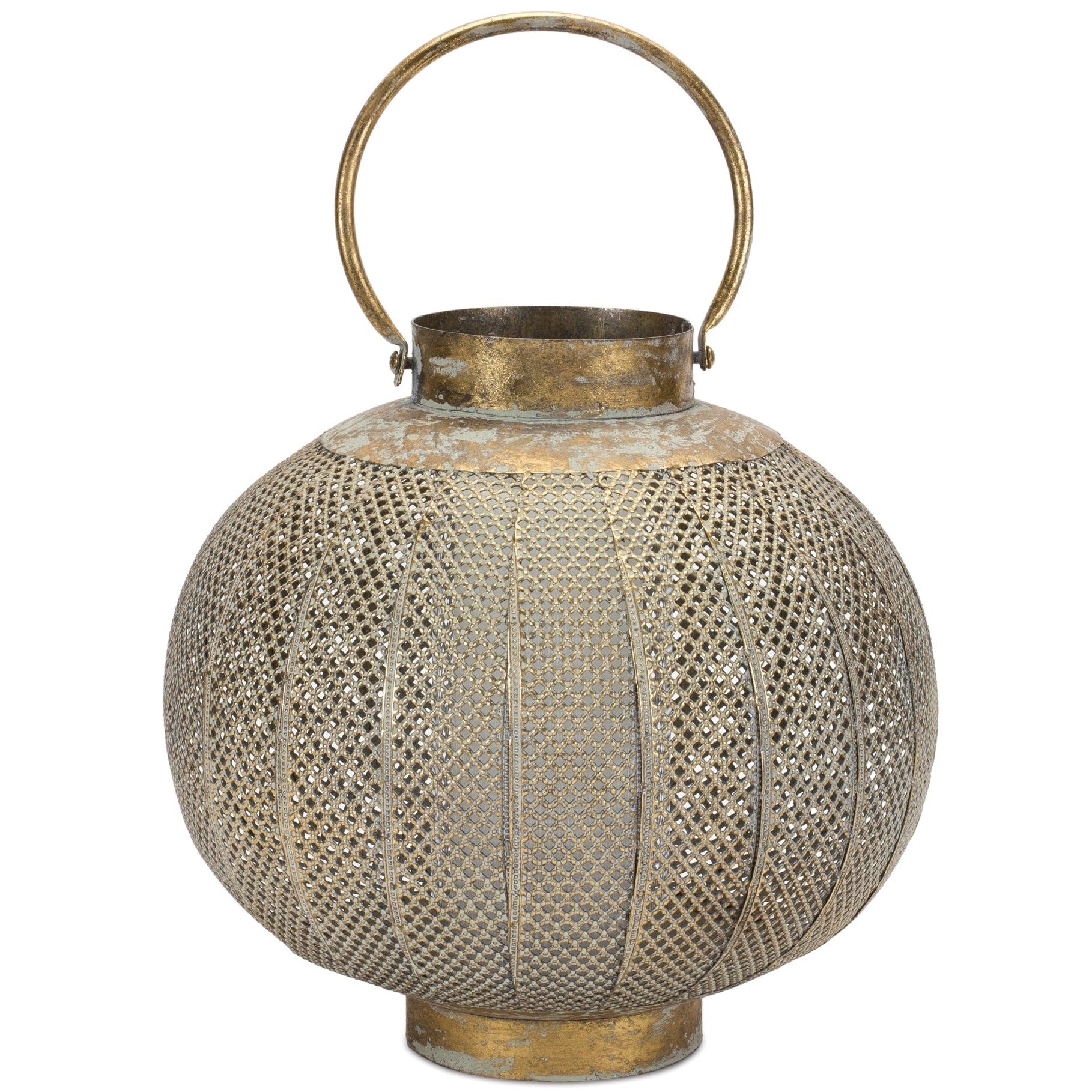 Add a warm, enchanting glow to your home with this beautifully crafted punched metal lantern. Featuring an intricate Bohemian-inspired cutout pattern, it casts captivating light patterns when illuminated. The distressed copper-green finish lends a touch of rustic charm, while the sturdy metal frame and glass insert ensure long-lasting beauty. Perfect as a tabletop accent or a hanging lantern, this piece brings effortless elegance and ambient lighting to any indoor space.