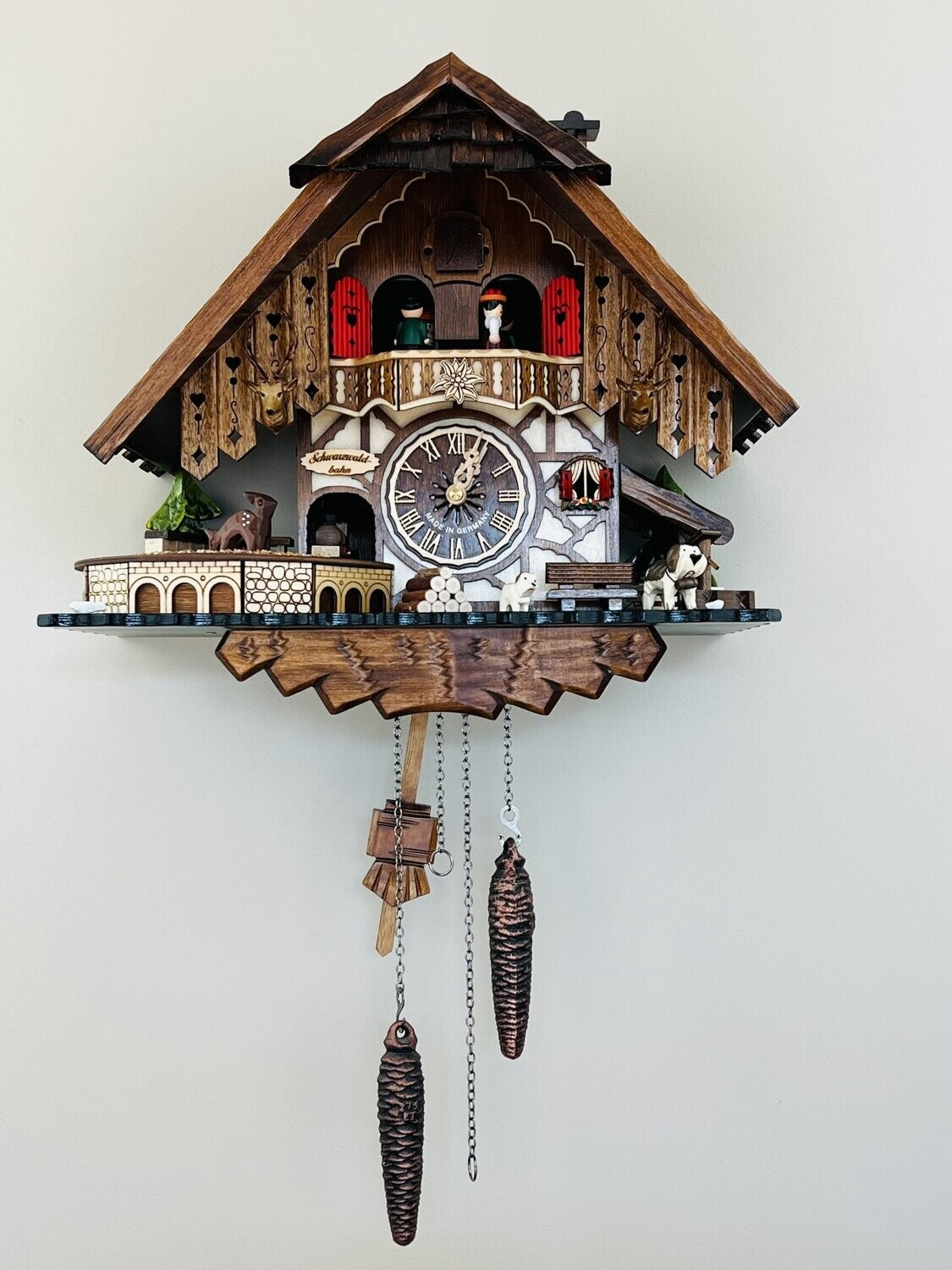 This Quartz Cuckoo Clock features a charming chalet design with a moving train and dancing figures. Measuring 13.5 inches in height, 15 inches in width, and 8.8 inches in depth, it fits beautifully on any wall or mantel. The clock cuckoos the hour with a lively cuckoo bird and plays 12 different melodies for a playful and decorative touch. It includes volume control and silent mode for flexibility. Requiring 3 C-size batteries (not included), this clock blends traditional craftsmanship with whimsical movement, making it an engaging centerpiece for living rooms, kitchens, or collectors of chalet-style cuckoo clocks.