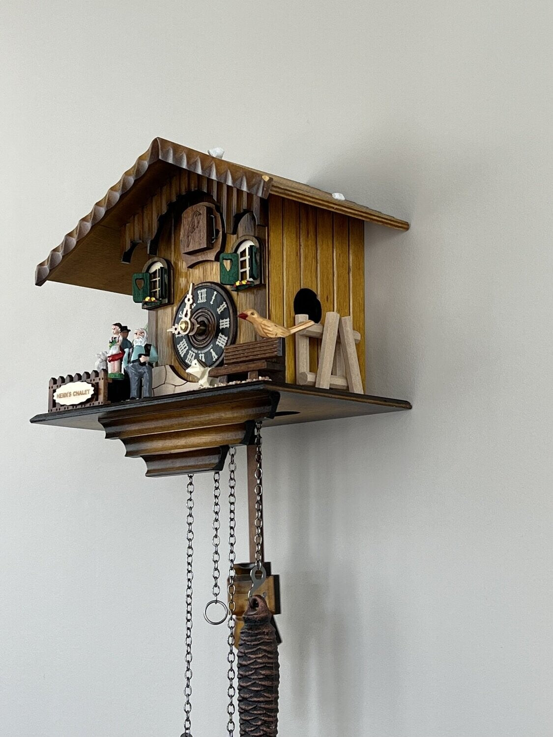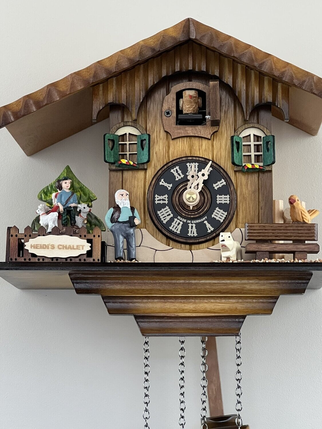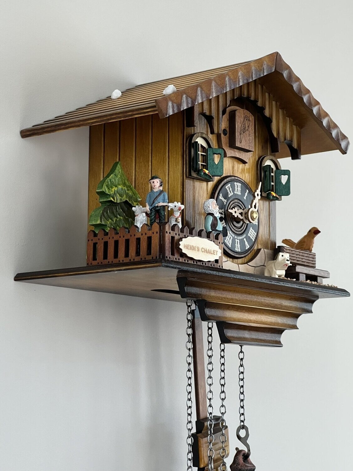 Quartz Cuckoo Clock – Heidi's Chalet – 8-inch Height with Revolving Figures – By River City Clocks