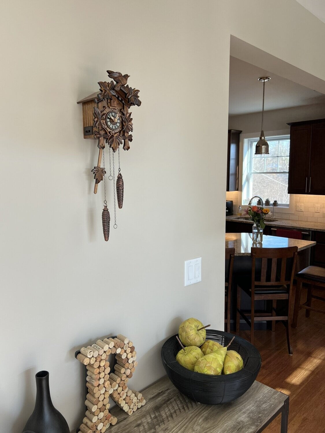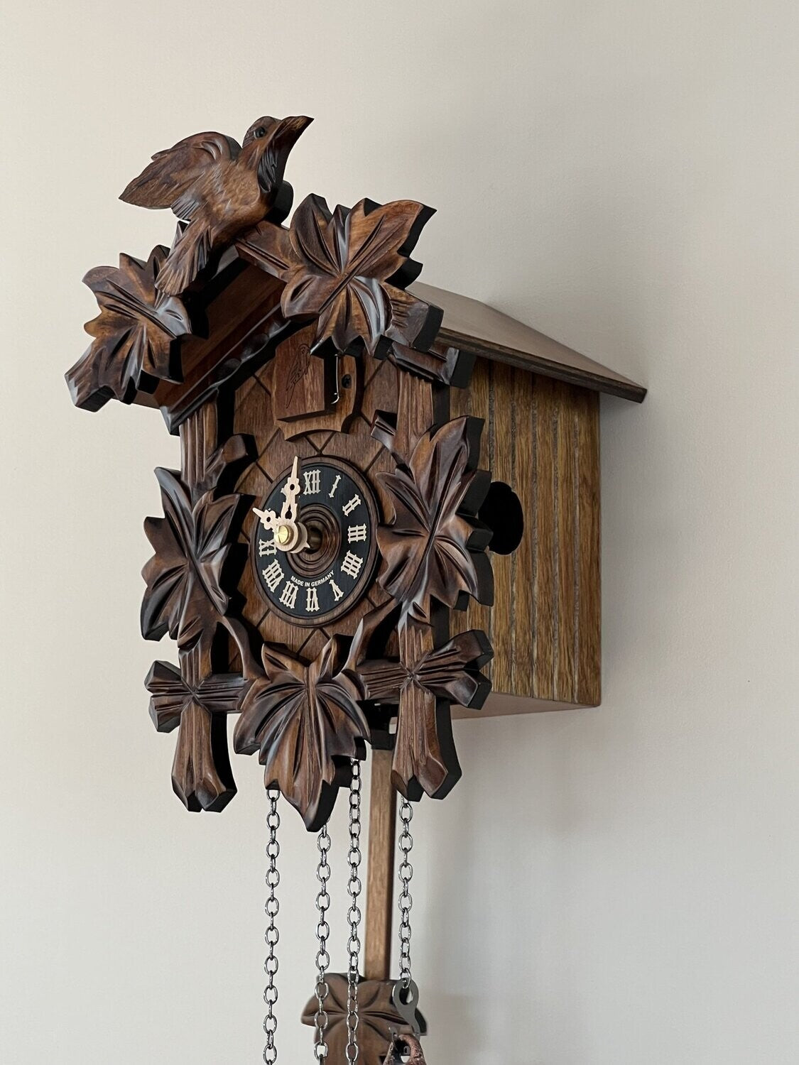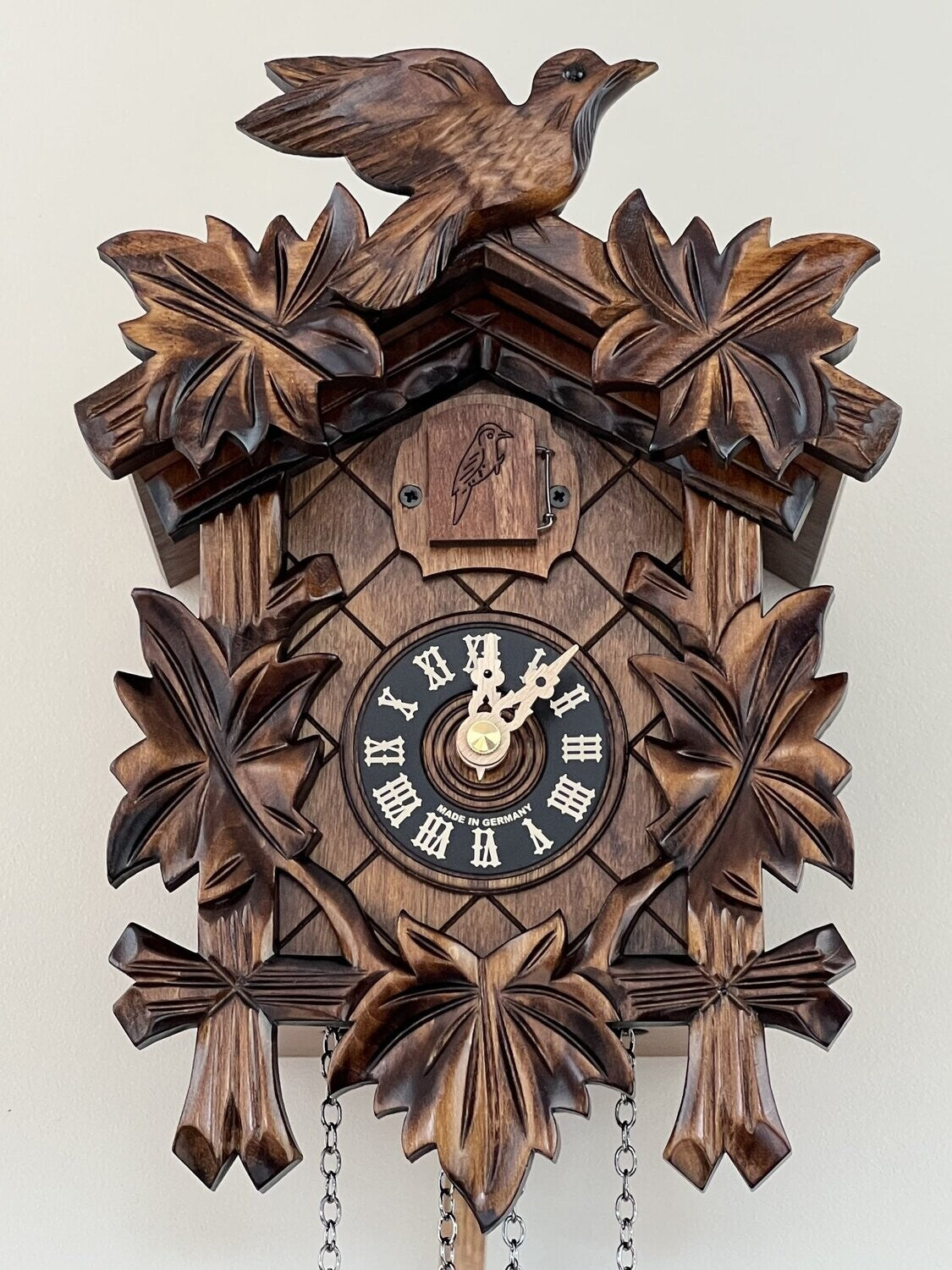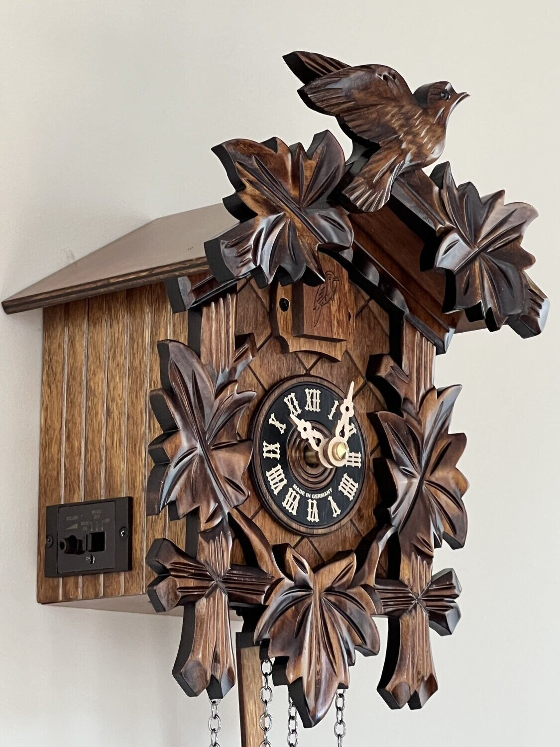 This 9-inch quartz cuckoo clock features an elegant design with five leaves and a bird, offering a charming addition to any living room or hallway. Powered by a quartz movement, the clock plays one of 12 melodies at the top of every hour, ranging from “Happy Wanderer” to “Für Elise,” and offers volume control plus a built-in light sensor for automatic nighttime silence. A gently swinging pendulum adds a dynamic touch. The case is finely crafted (origin: Germany) and the clock runs on three C-size batteries (not included). Covered by a two-year limited warranty, this piece is ideal for those seeking musical charm with reliable timekeeping.