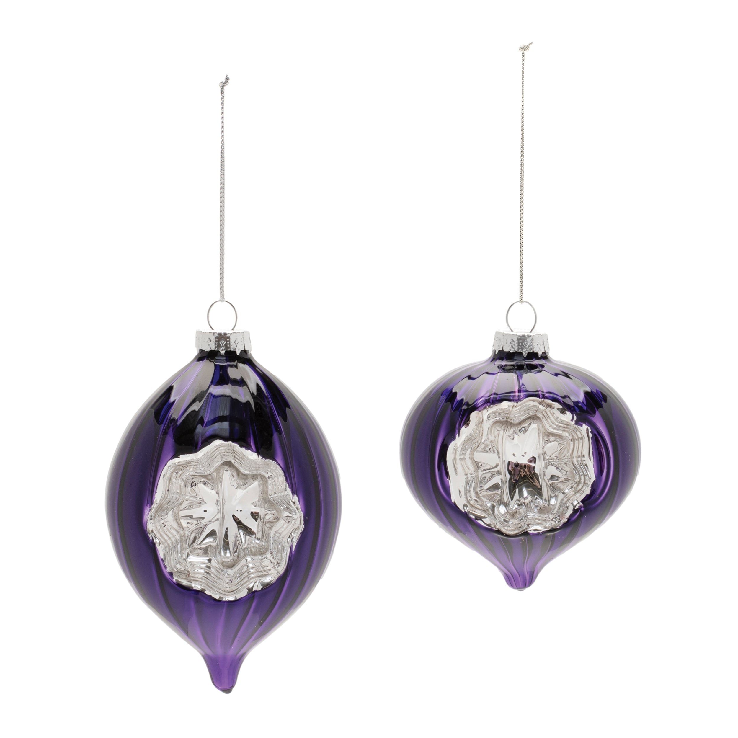 Add a touch of vintage glam to your holiday décor with this set of 12 Purple & Silver Reflector Glass Ornaments. Crafted from glass, each ornament features rich jewel-tone purple coloring with radiant silver starburst insets. The set includes two traditional shapes measuring 3.25 x 3 x 3.5"H and 4.25 x 3 x 3.5"H, creating a layered and dynamic look on any tree or display.