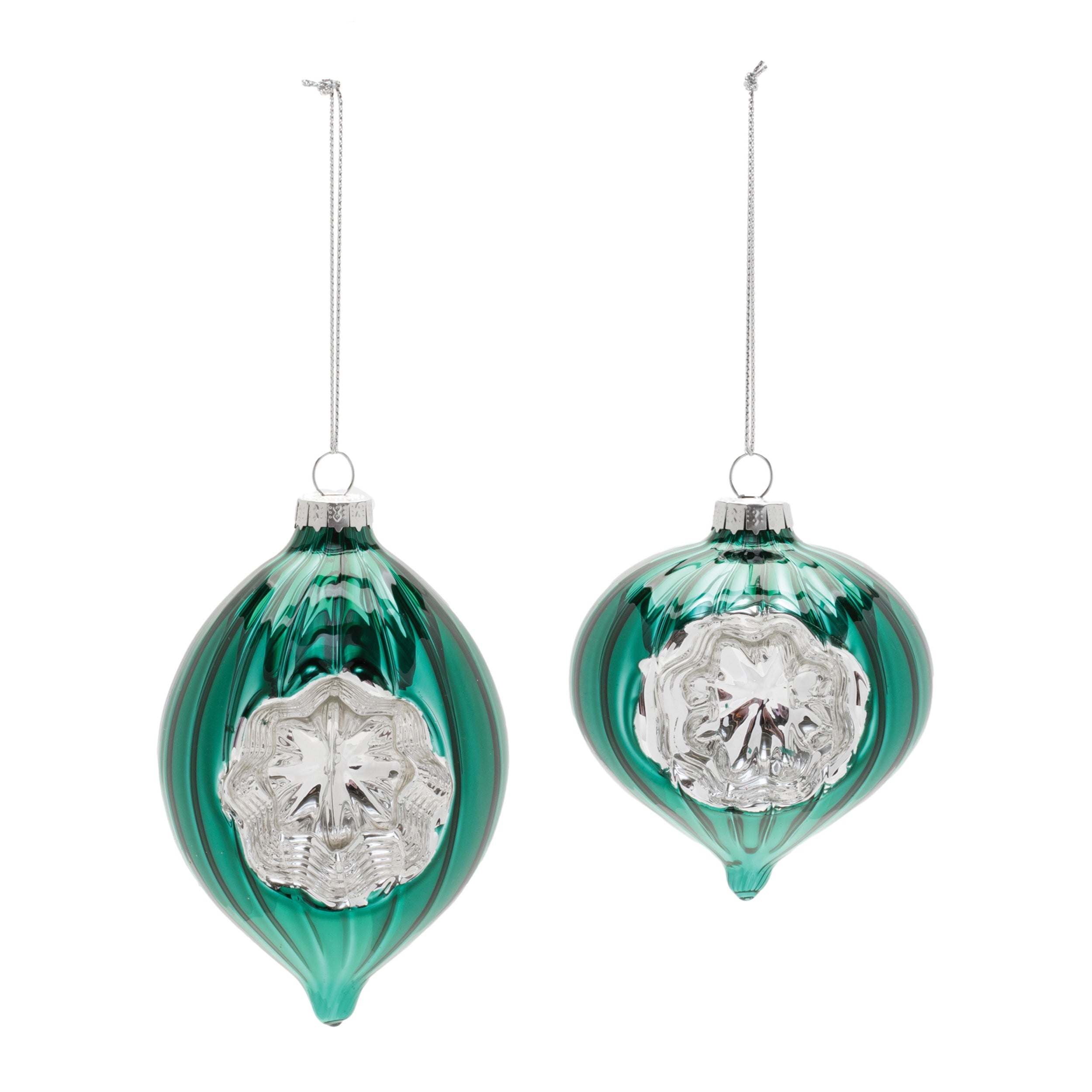 Infuse your holiday décor with vintage elegance using this set of 12 Green & Silver Reflector Glass Ornaments. Crafted from glass, each ornament features a radiant jewel-tone green finish with shimmering silver starburst insets. The set includes two traditional shapes measuring 3.25 x 3 x 3.5"H and 4.25 x 3 x 3.5"H, adding layered dimension and visual interest to any tree or display.