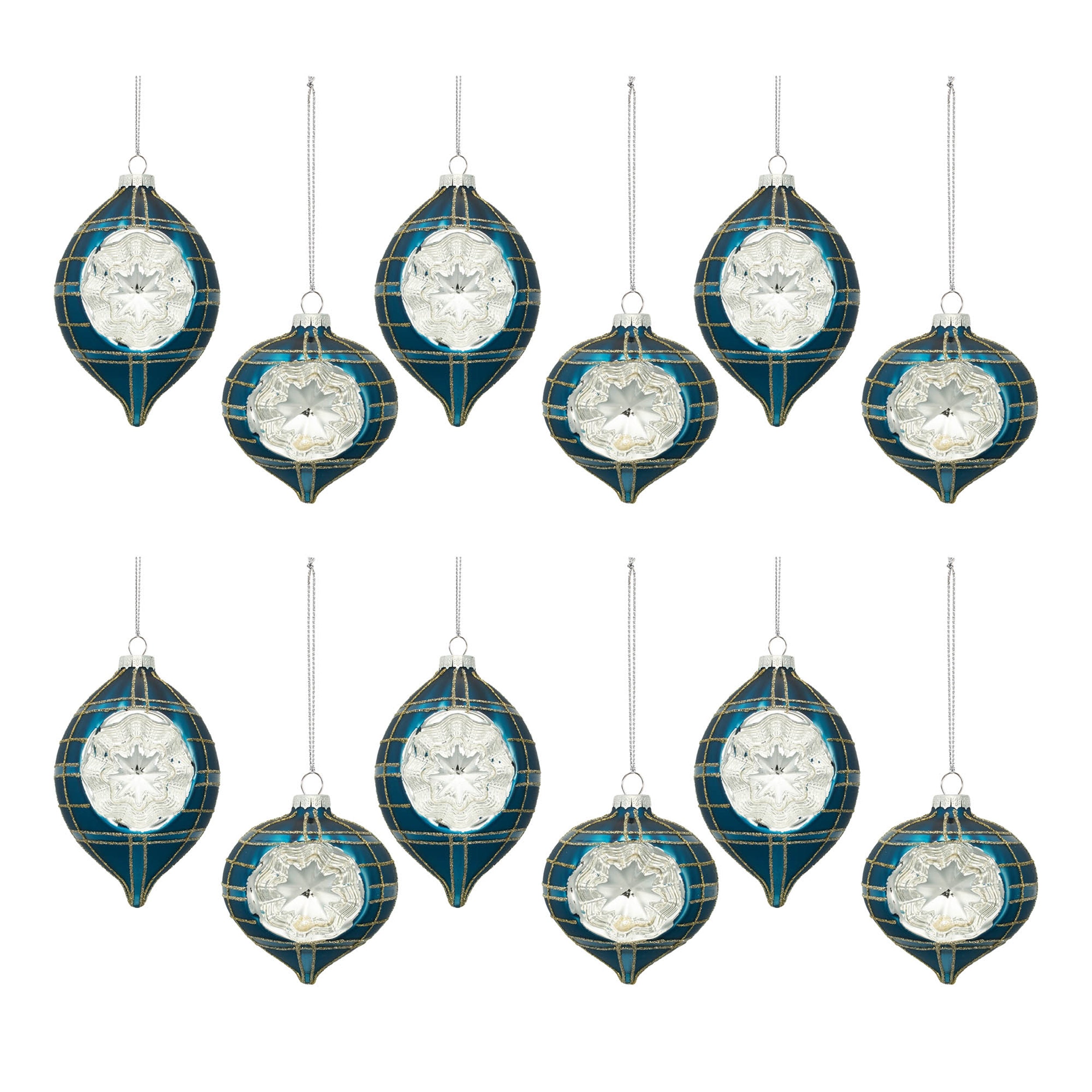 - Set of 12 glass reflector ornaments in green with metallic silver accents