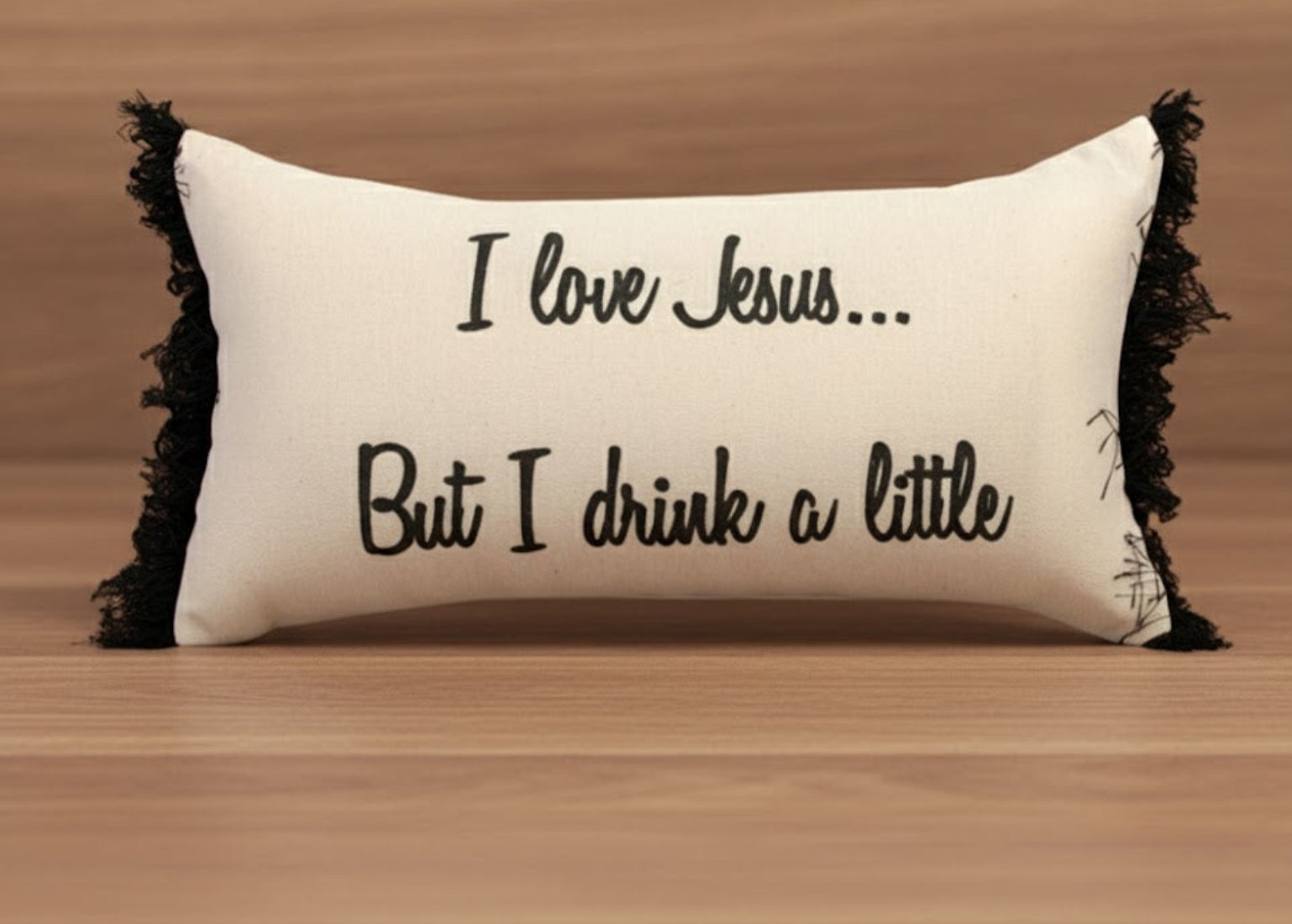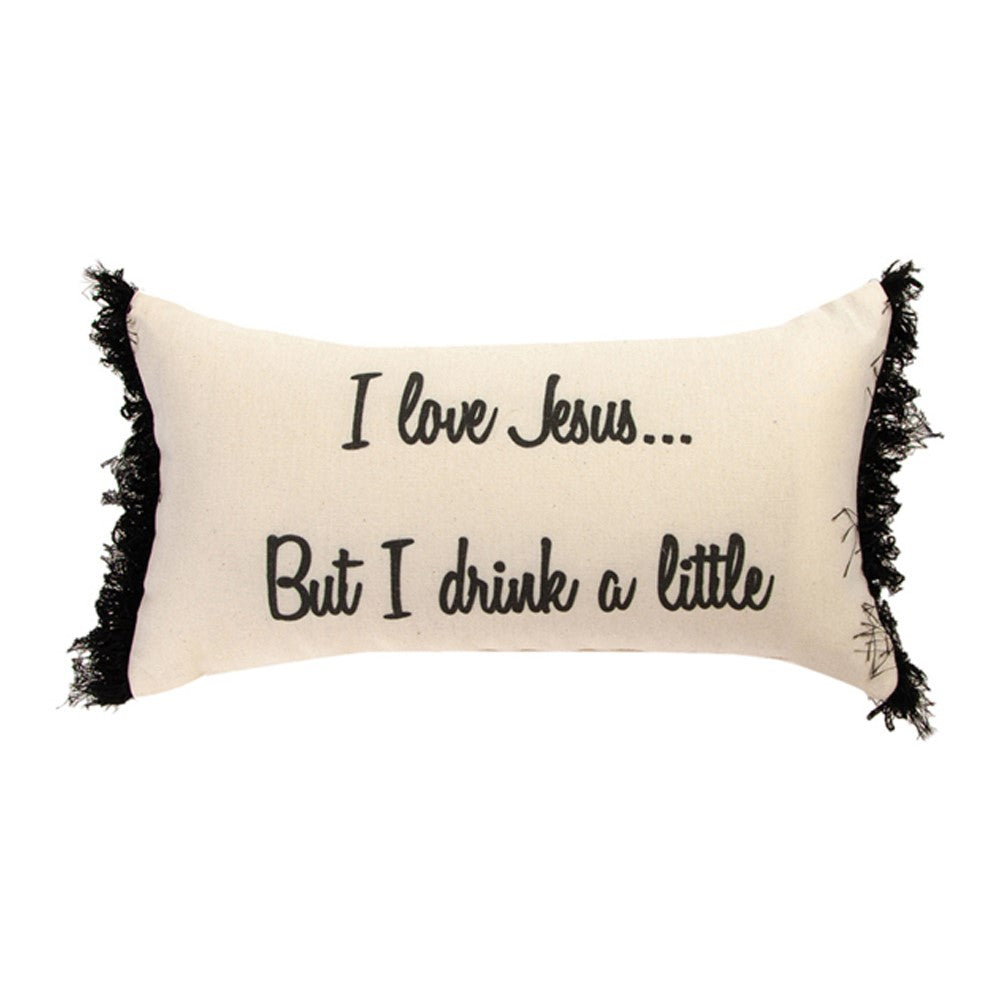 SKU - MWWSHLJDLReligious Humor Pillow 17x9 Inch – I Love Jesus But I Drink a Little by Manual Woodworkers