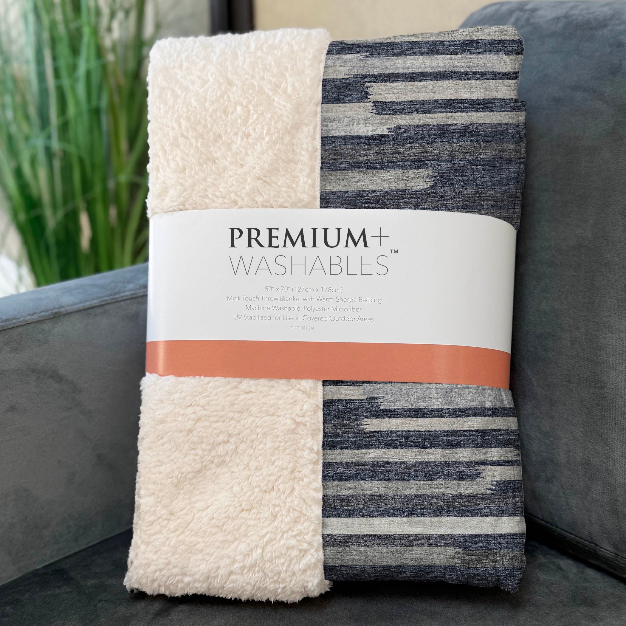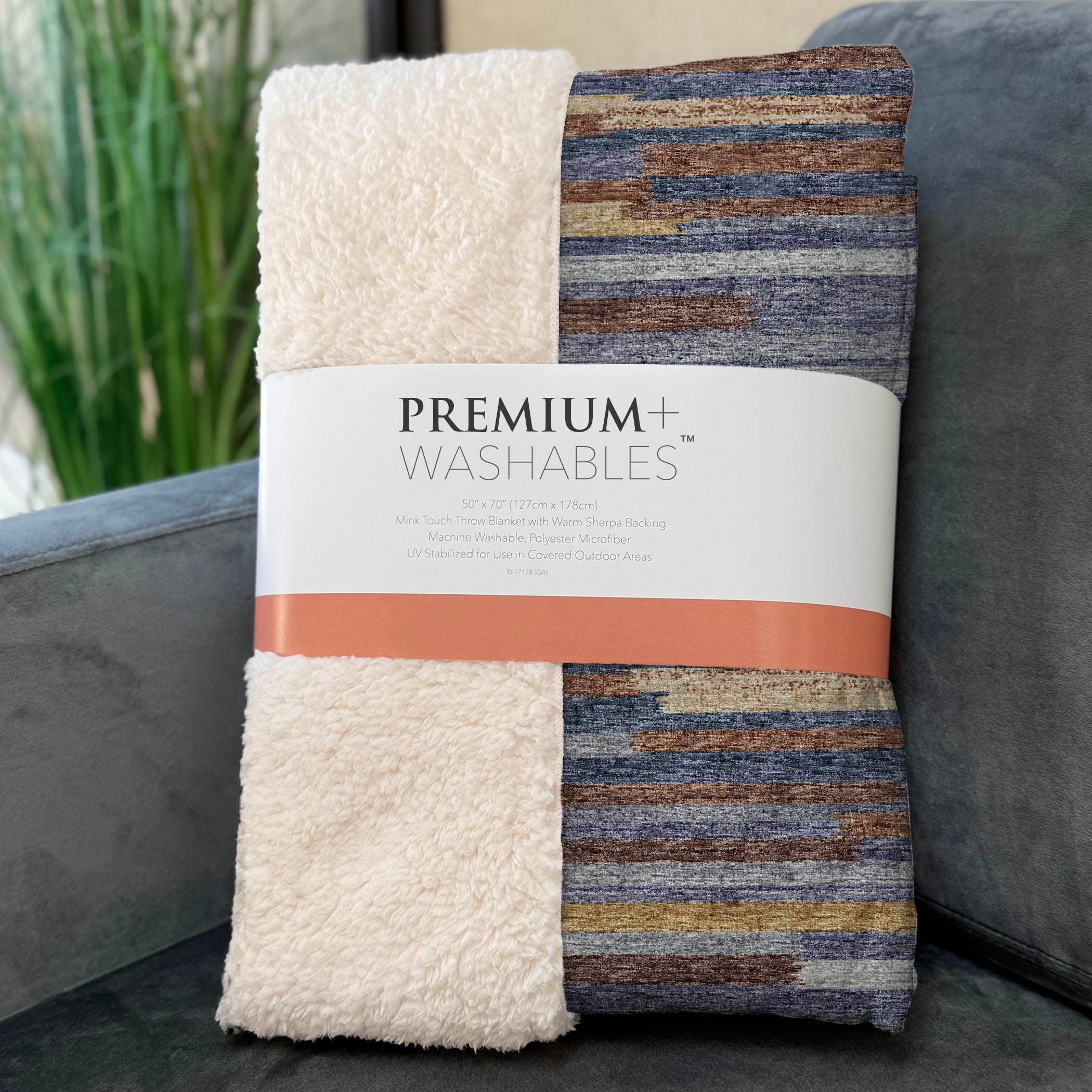 Stackable horizontal bars weave their magic across a stunning interplay of stripes, inviting a cozy embrace for any transitional space. This reversible throw blanket by One Pixie Street features a luxuriously soft-touch front paired with a warm cozy backing, providing comfort and versatility for indoor lounging.