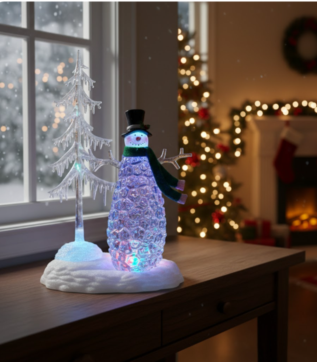 The Rotating LED Snowman with Pine Tree brings cheerful movement and colorful light to your holiday décor. Crafted from durable plastic, this festive figurine features a classic snowman dressed with a hat and scarf alongside a decorative pine tree. Multicolor LED lights with a rotating bulb create a lively glow that enhances tabletop, shelf, or mantel displays. Designed for convenience, it operates using three AA batteries (not included) or the included USB cord and features a 6-hour timer for automatic on and off operation. This charming accent adds warmth and visual interest to any indoor holiday setting.