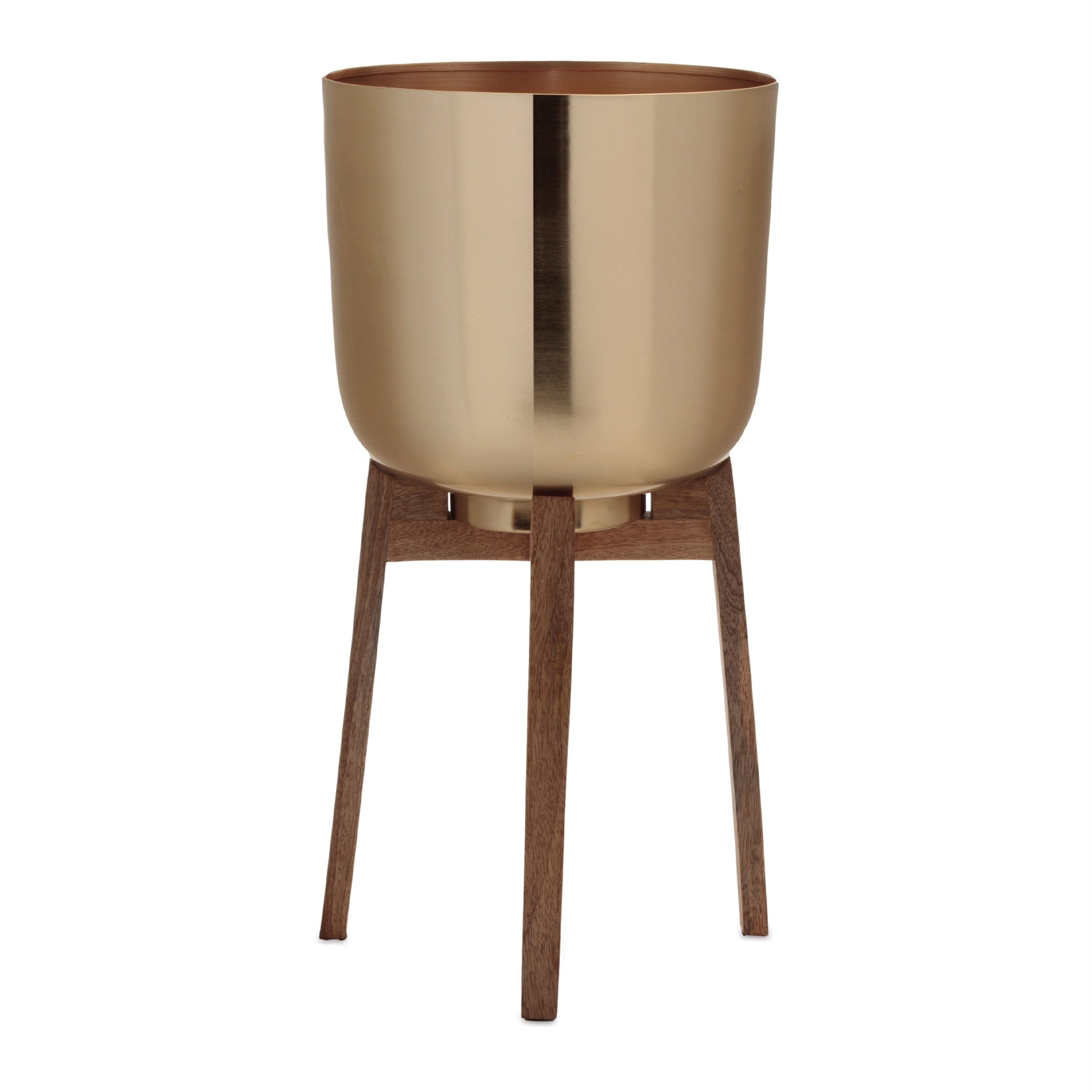 Round Metal & Mango Wood Planters 16"H, Gold Rustic Indoor (Set of 2) By Melrose