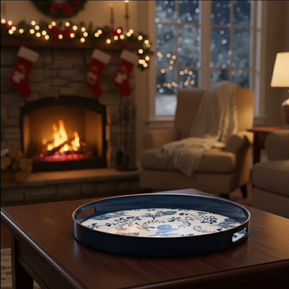 Round Pinecone Winter Tray Blue and White Christmas Style – 13.5" by Melrose