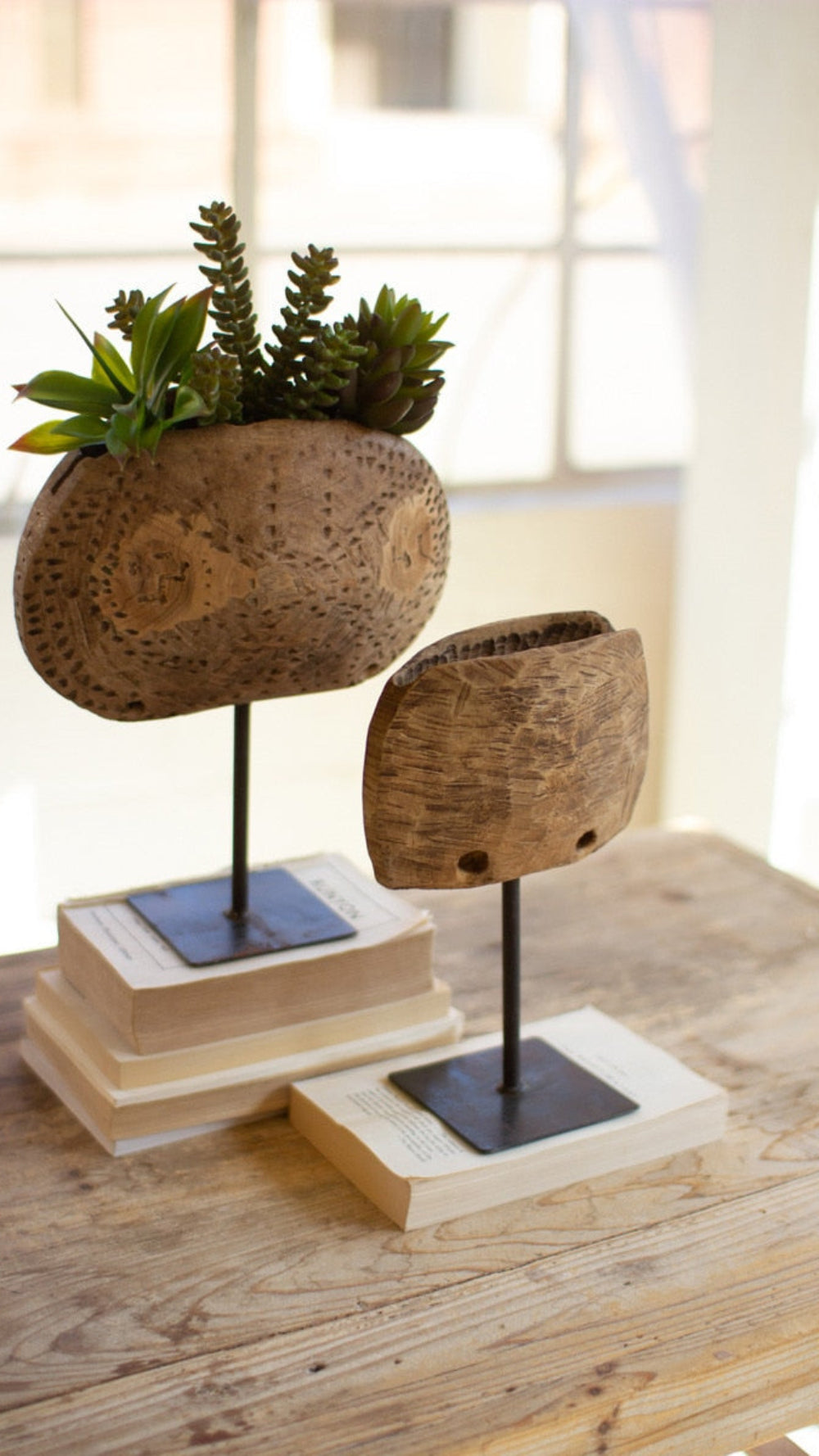 Add rustic charm to your indoor or outdoor space with the Set of Two Repurposed Wooden Cowbell Planters on Iron Stand by Kalalou. Each planter is handcrafted from repurposed wood, shaped like a cowbell, and mounted on a durable iron stand for stability and elevated display. The set includes a large planter measuring 10" x 5" x 12"t and a small planter measuring 7" x 3.5" x 10.5"t, perfect for succulents, small flowers, or decorative arrangements. These versatile planters complement farmhouse, rustic, or industrial décor and make an ideal gift for plant lovers or home décor enthusiasts. Their lightweight yet sturdy construction ensures easy placement anywhere in your home or garden.