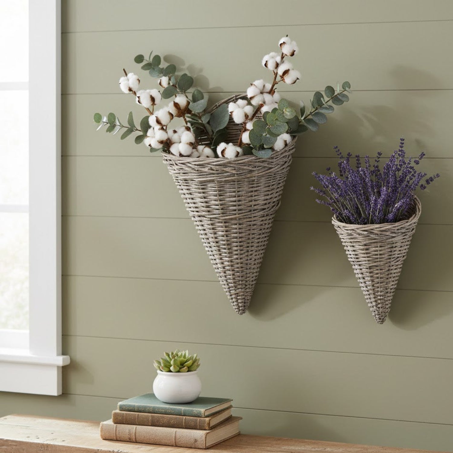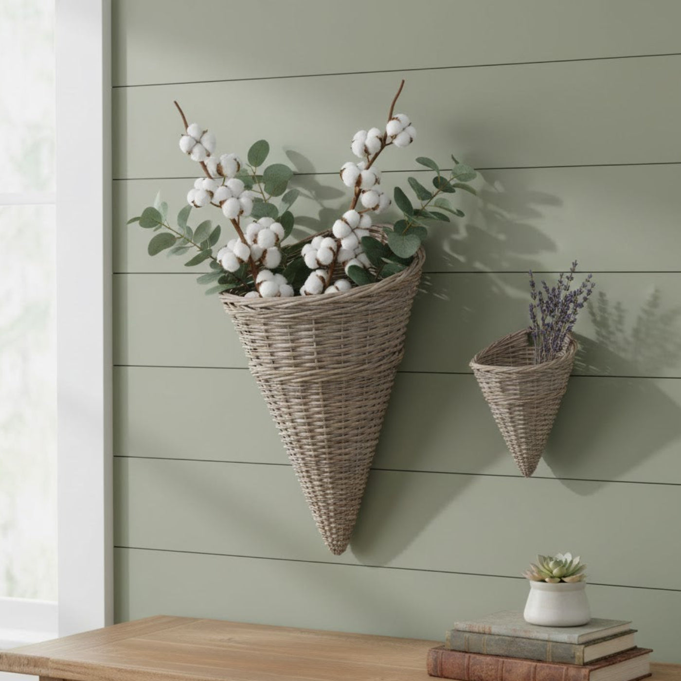 Add rustic character to your home with this Grey Woven Willow Wall Basket Set. Handcrafted from natural willow, these baskets feature a textured woven pattern and soft grey finish that blend beautifully with farmhouse, cottage, rustic, and modern decor styles. Their deep design provides practical storage for everyday items, florals, greenery, or seasonal accents, while the built-in handle openings make hanging simple and secure. Perfect for entryways, kitchens, living rooms, or hallways, these baskets bring warmth and natural charm to any wall. The set includes two assorted sizes to create balanced, eye-catching displays. The small basket measures 11.5 x 9 x 13.25, and the large basket measures 13 x 10.25 x 16.5, offering versatile styling options throughout your home.