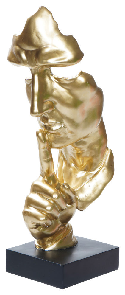 Enjoy an intricate piece of decor in your home, this stunning sculpture features an abstract take on the silence man. Featuring a beautiful gold finish and a black base for a balance between glam and elegance. Perfect for any home interior looking to add a visually interesting touch into the decor!