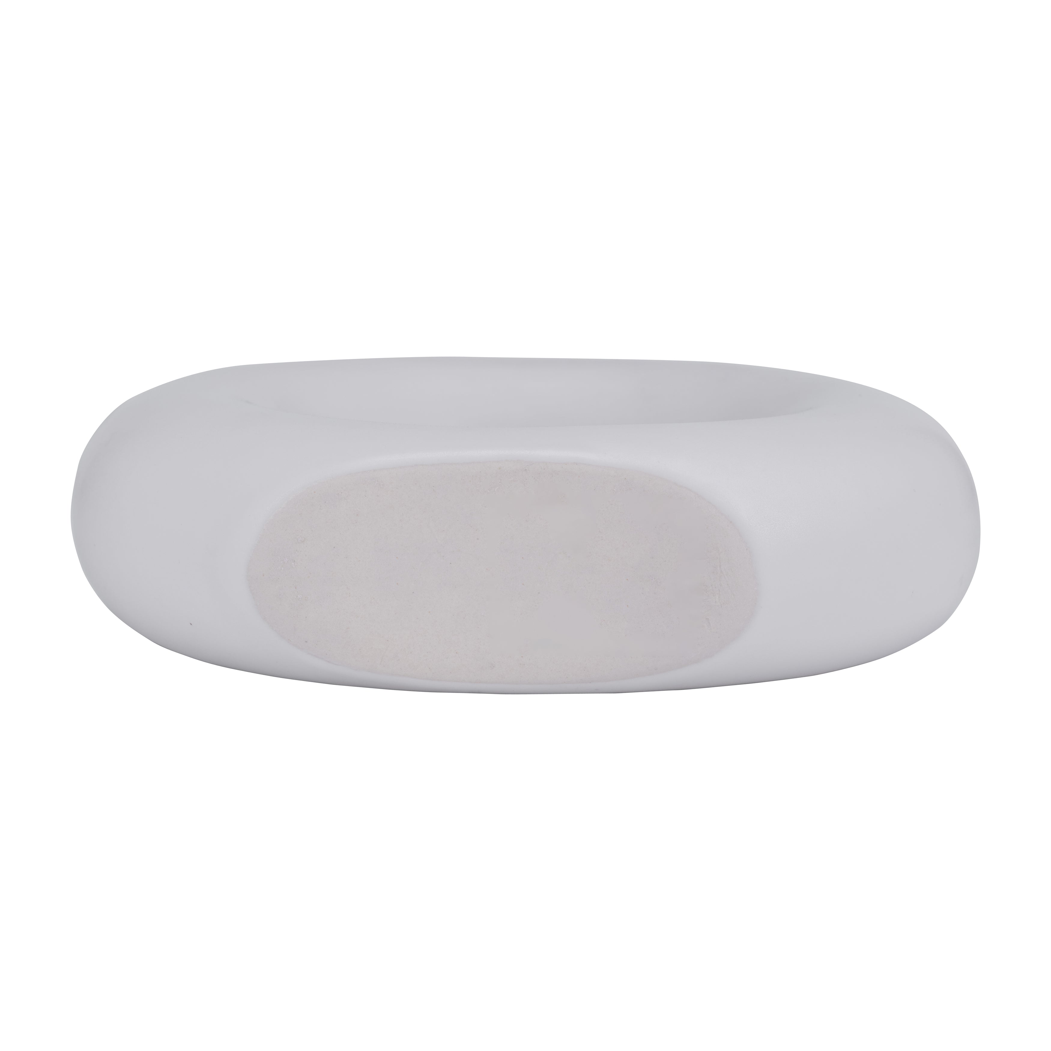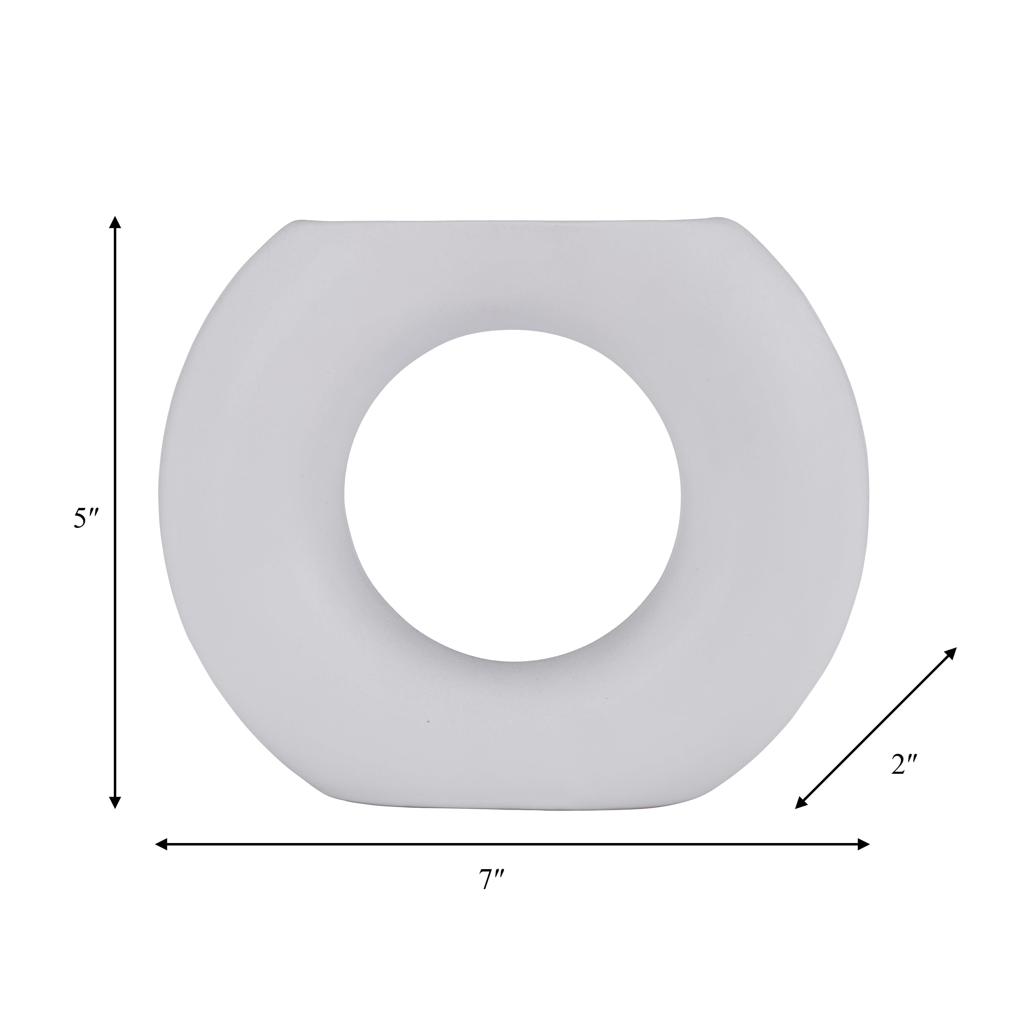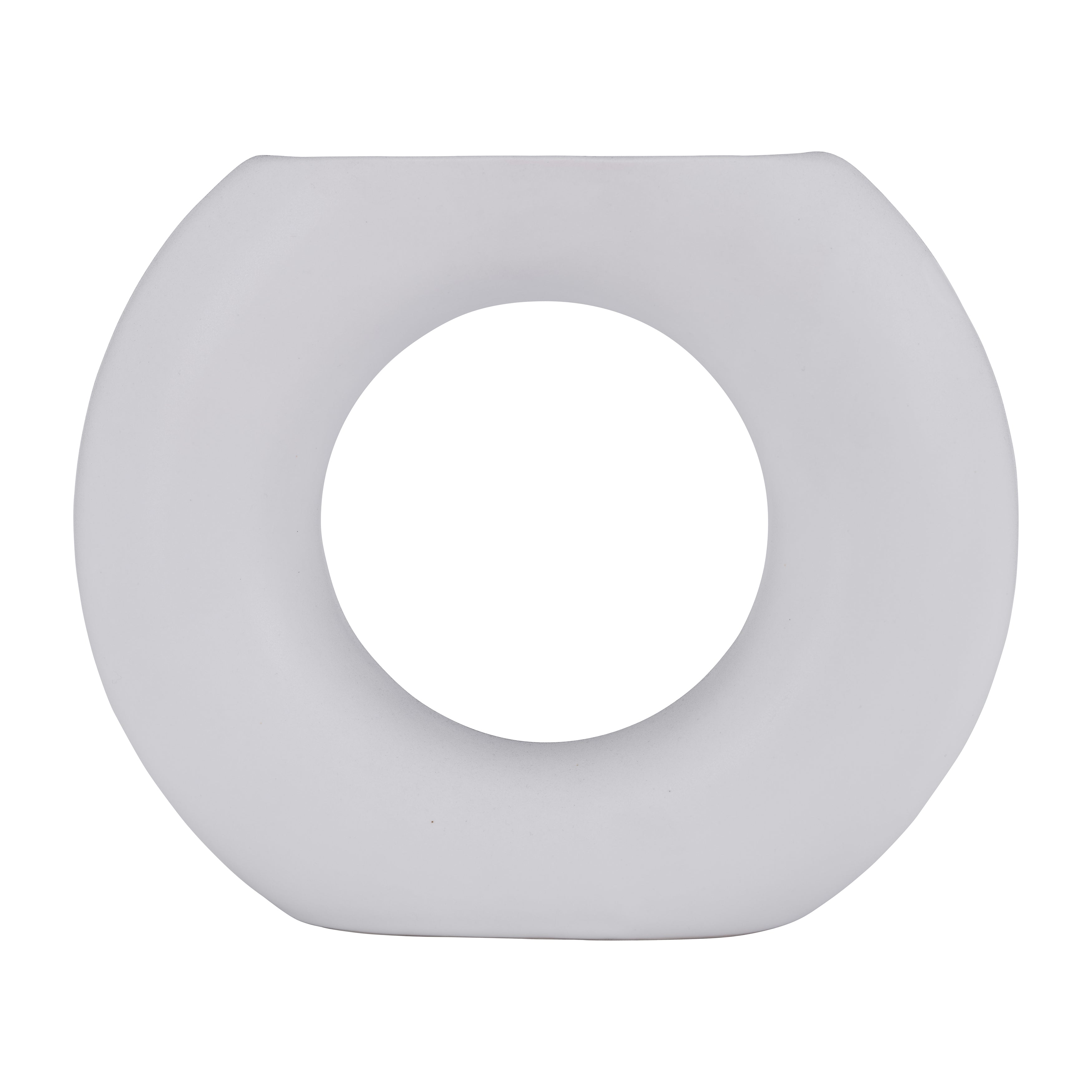 This unique ceramic vase comes in a circular cut-out design resembling a donut. A long narrow opening on top allows for your favorite flowers or greenery. The vase comes in a classic white color.