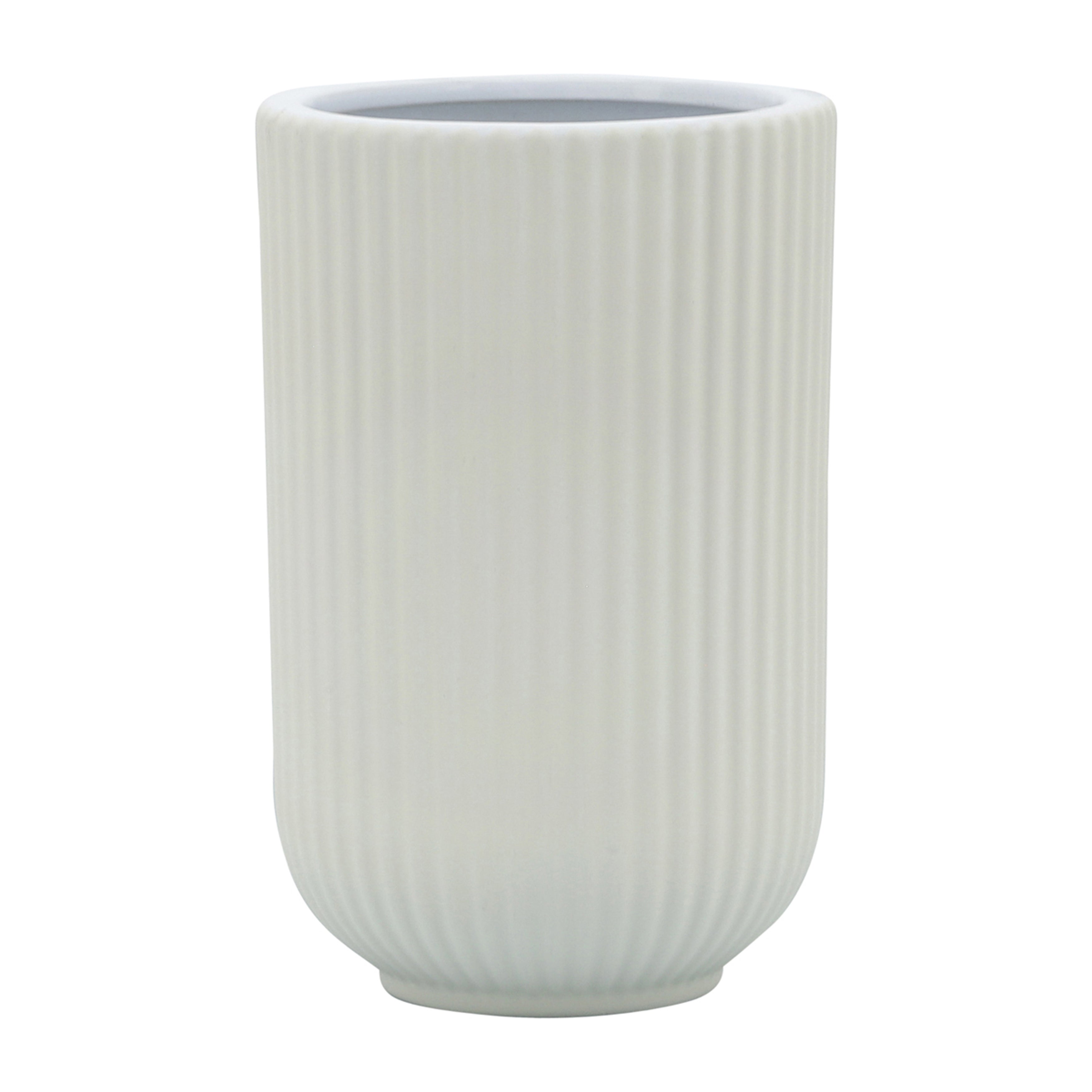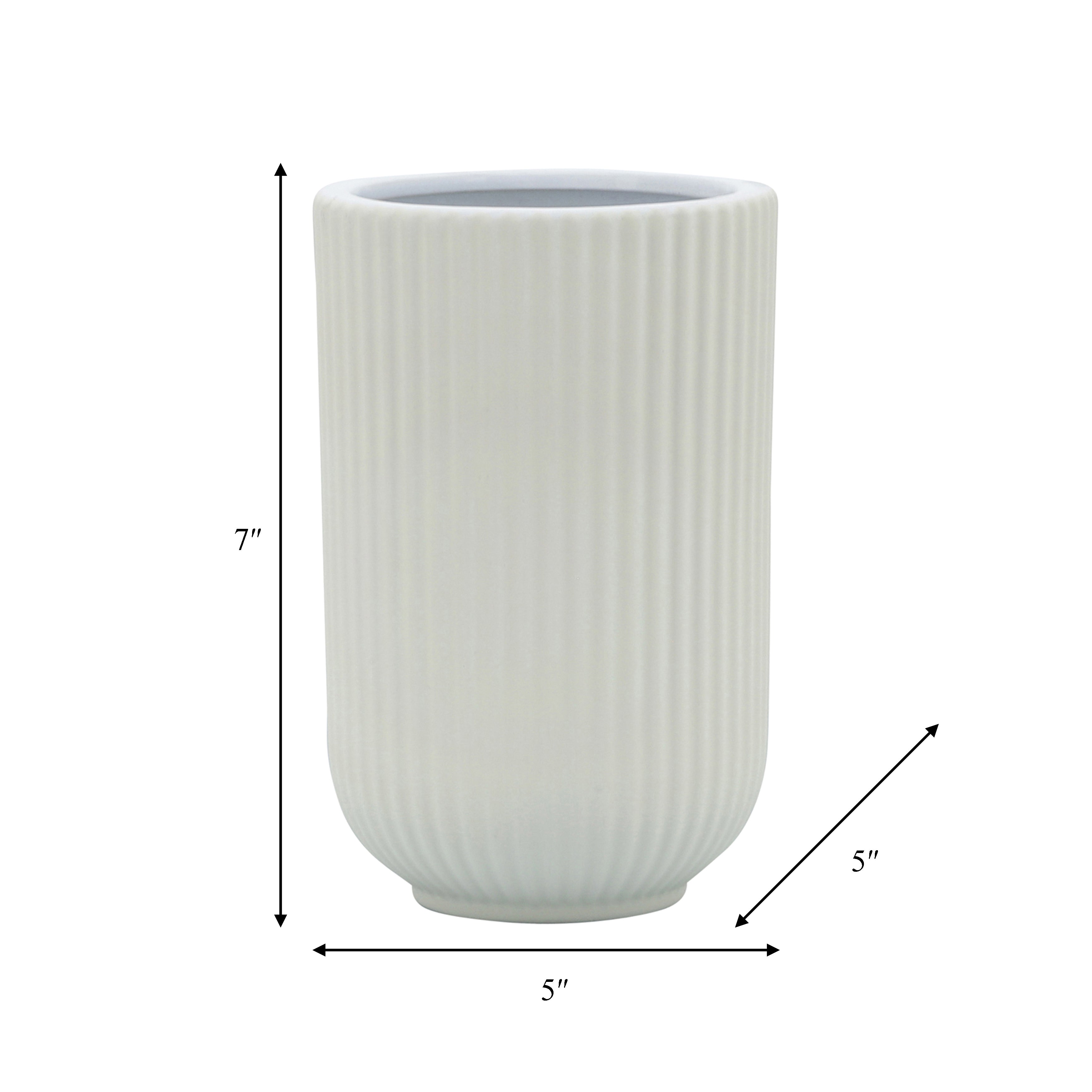 This ceramic vase comes in a simple shape ending in a wide hole for placing your floral arrangements or greenery. It comes in a classic solid white color with a trendy ridged design.