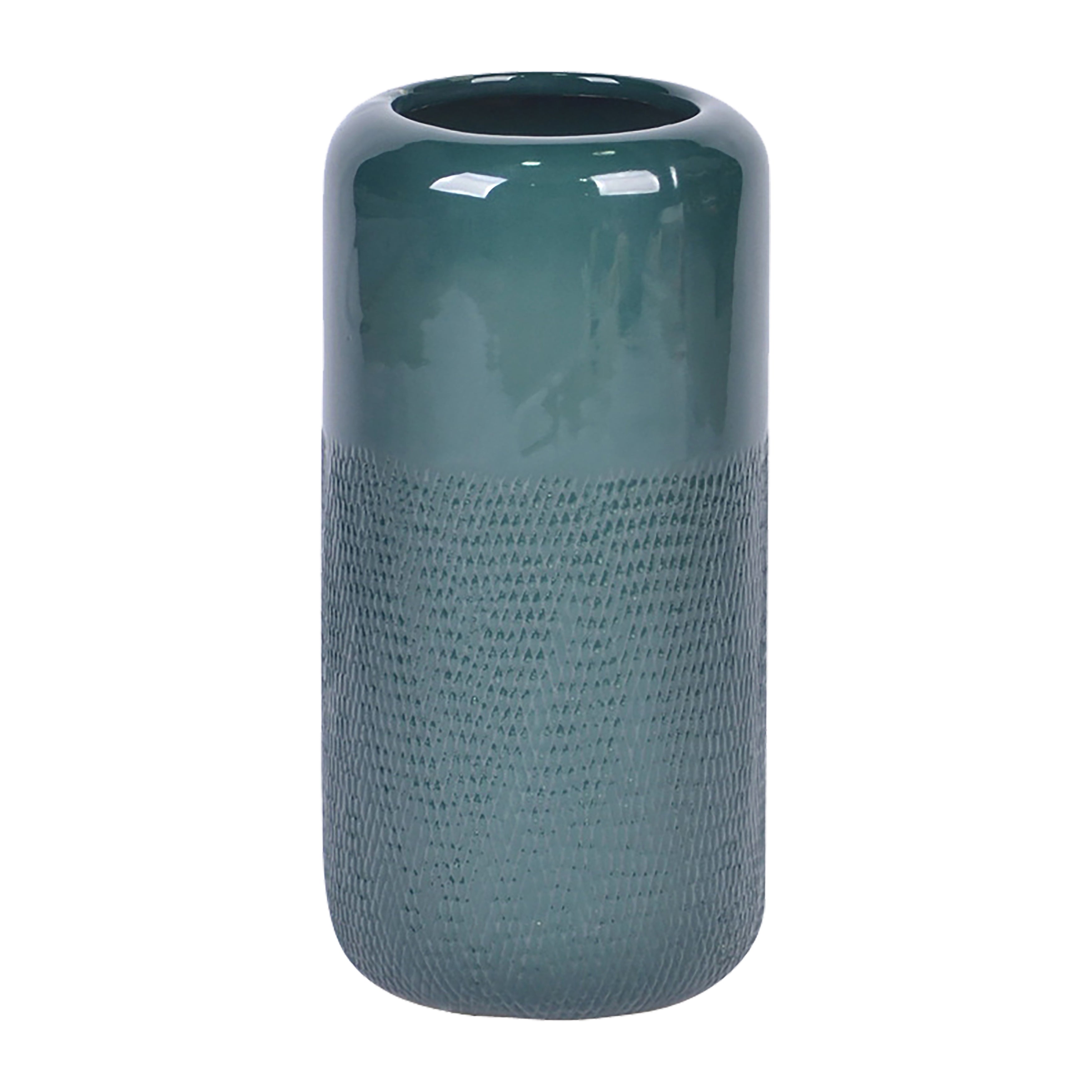 This ceramic vase comes in a simple circular design in a rich forest green color. The bottom half features a unique grooved design while the top is solid.
