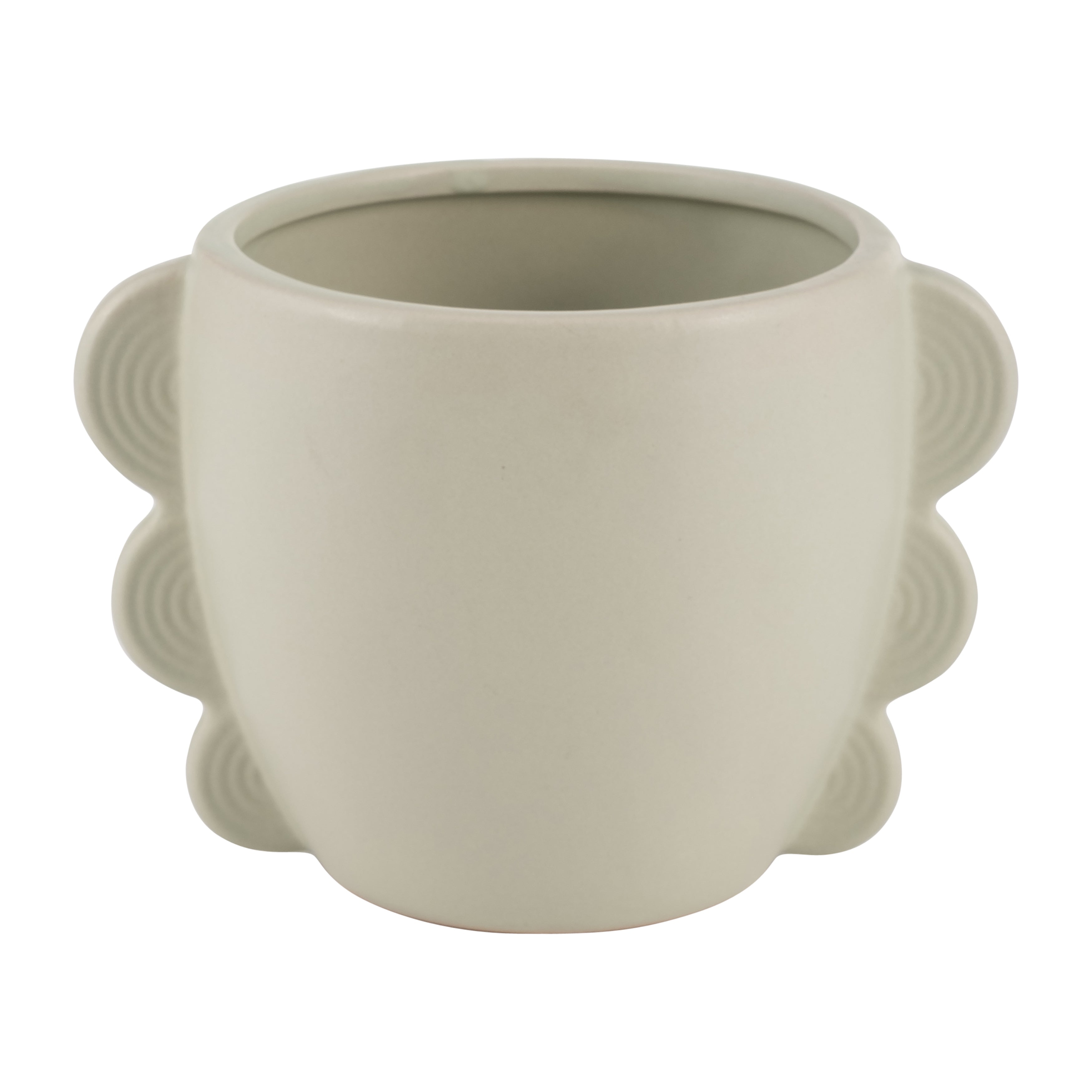 This ceramic vase features a creative, modern design. The rounded wide shape includes a creative series of eared designs on each side. It comes in a beautiful cucumber green color.