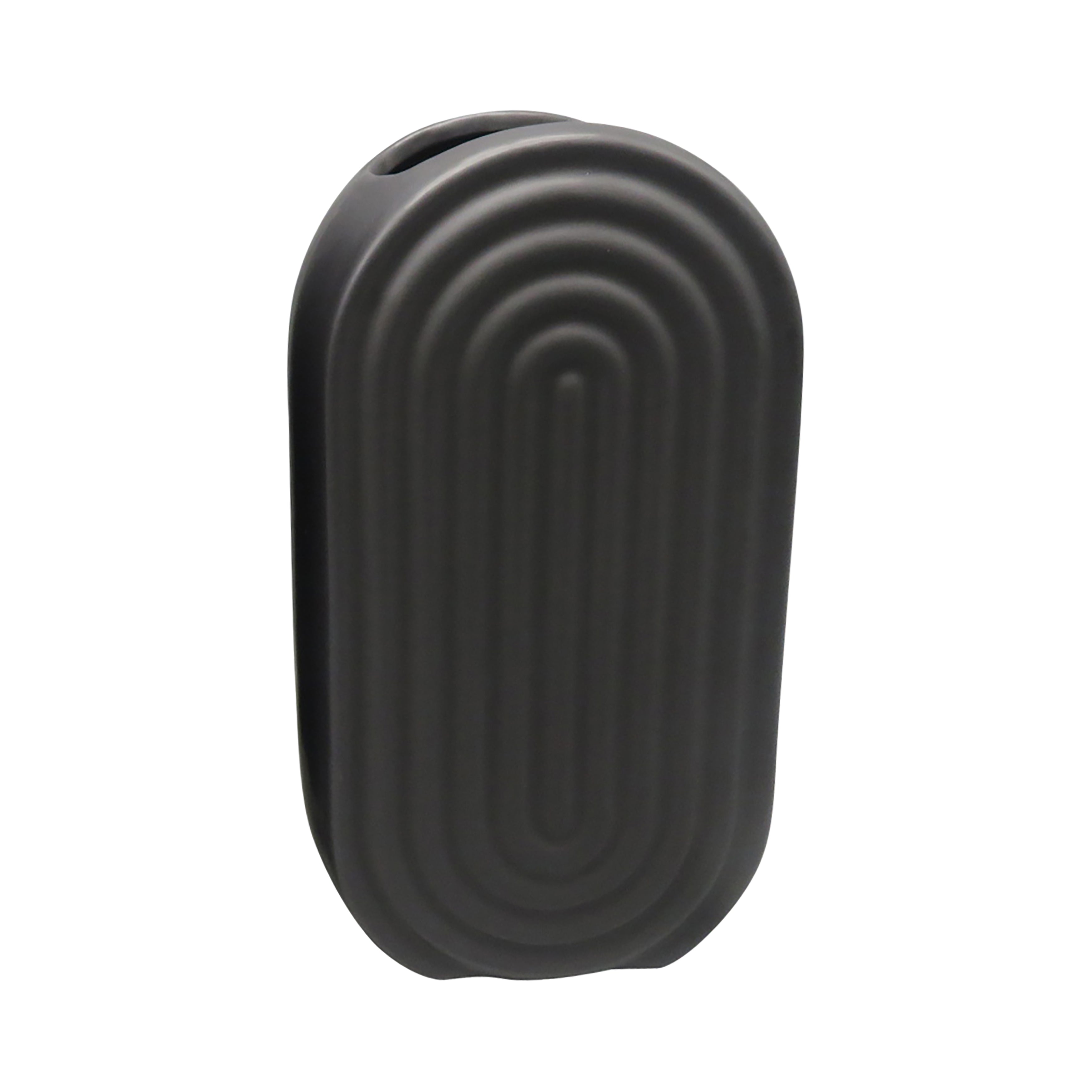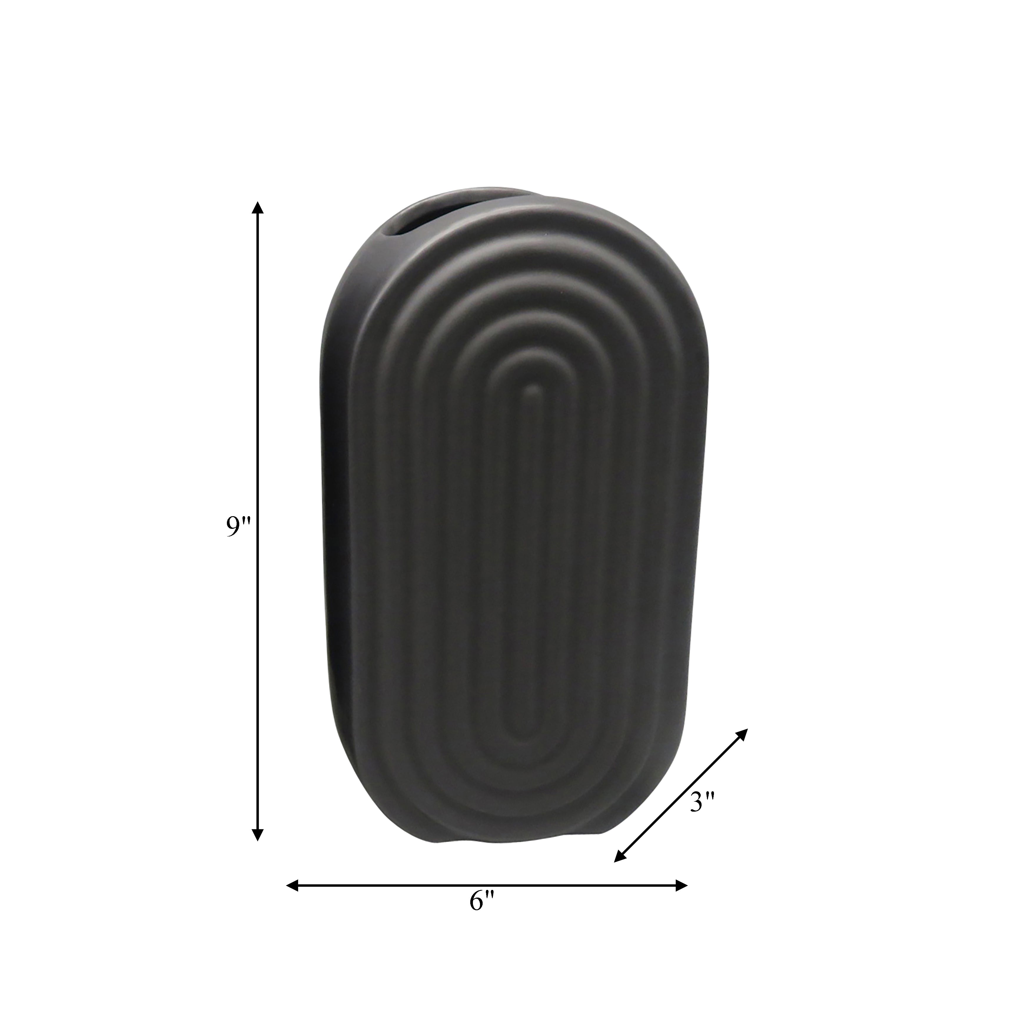 This gorgeous oval ceramic vase comes in a beautiful classic black color and is designed with a creative ridged design with an opening on top for your floral display.