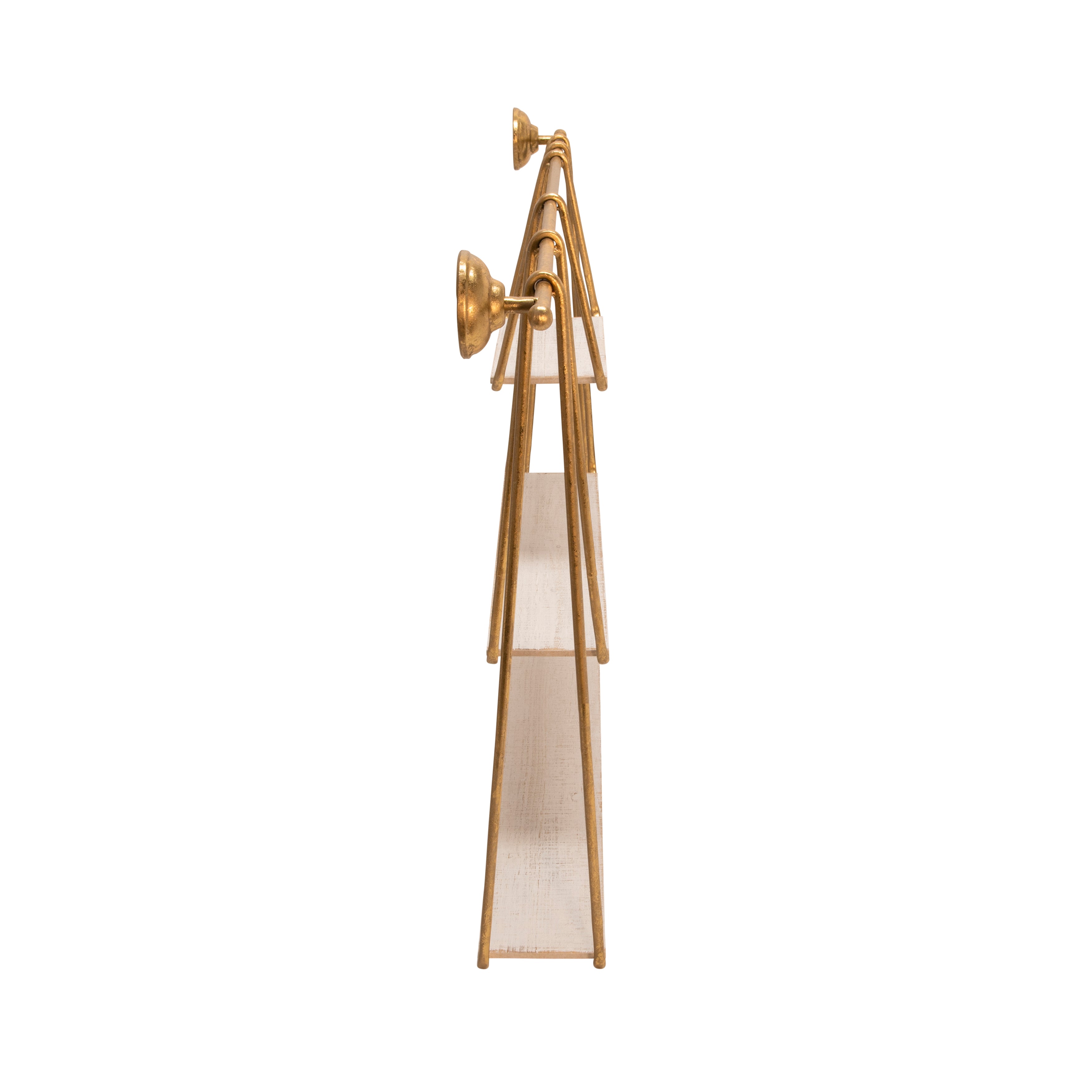 Decorate an empty wall in your abode with this chic 3-tier shelf. Inspired by a set of swings and made into an elegant shelf with a gold finish and a clear gloss. The swing base is made of wood with a white finish to neutralize the gold finish on the metal. A stunning balance of color and complimentary shelf sizes, perfect to display the small decor pieces you adore.