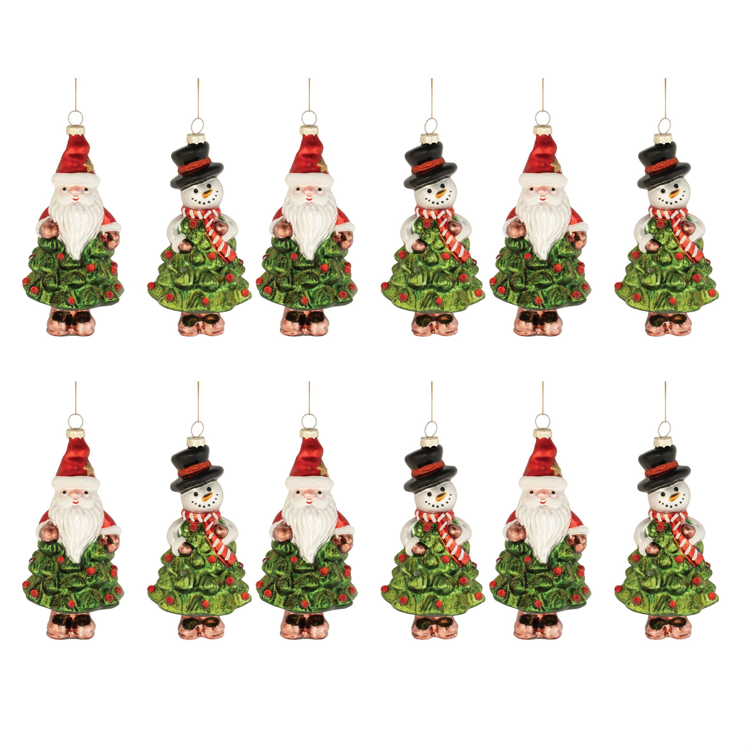 This Santa and snowman tree ornament set adds playful character to holiday décor displays. Crafted from glass, each ornament features a festive Santa or snowman design with a Christmas tree-shaped body in classic red, green, and white tones. A frosted glass finish softens the colors while subtle glitter accents add seasonal sparkle. Measuring approximately 5.5 to 6 inches tall, these ornaments create visual interest without overwhelming tree branches. Finished with champagne-colored ornament caps and string hangers, this set of 12 Santa and snowman tree ornaments is ideal for decorating Christmas trees, wreaths, or garlands throughout the holiday season.