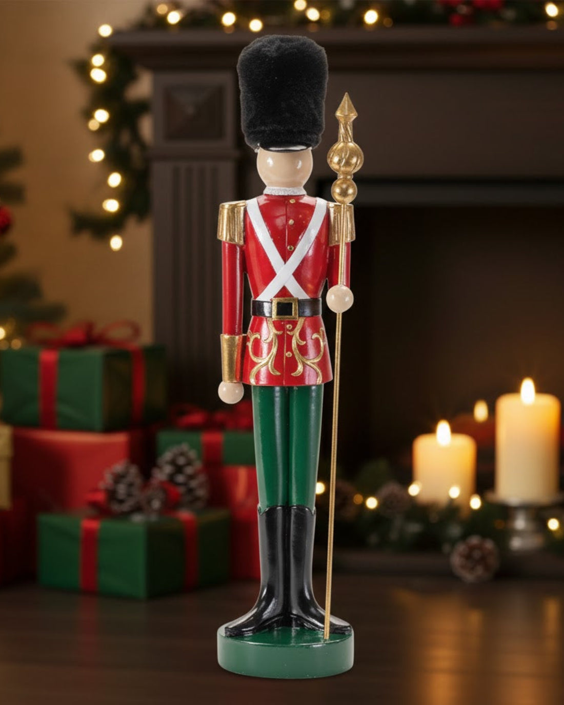 This holiday nutcracker soldier statue adds height, structure, and classic character to seasonal décor displays. Crafted from durable resin, the statue features a traditional King’s Guard–inspired uniform in red, green, and black with gold-tone detailing. Standing 19 inches tall, it creates a strong visual presence on mantels, tabletops, shelves, or entryway surfaces. The clean sculpted lines and timeless nutcracker styling make it easy to pair with garlands, greenery, or other holiday accents. Designed for indoor use, this decorative statue brings traditional Christmas appeal with a refined, modern finish.