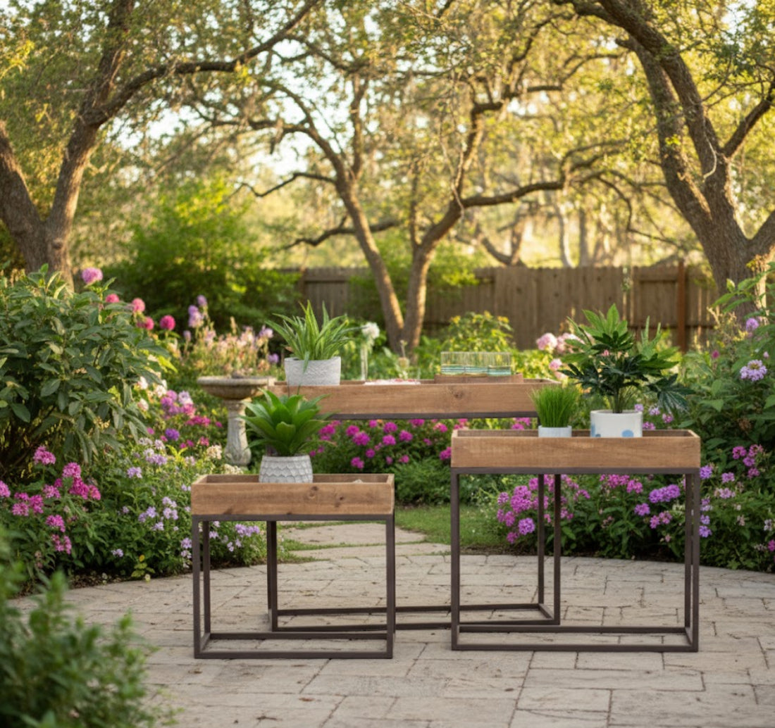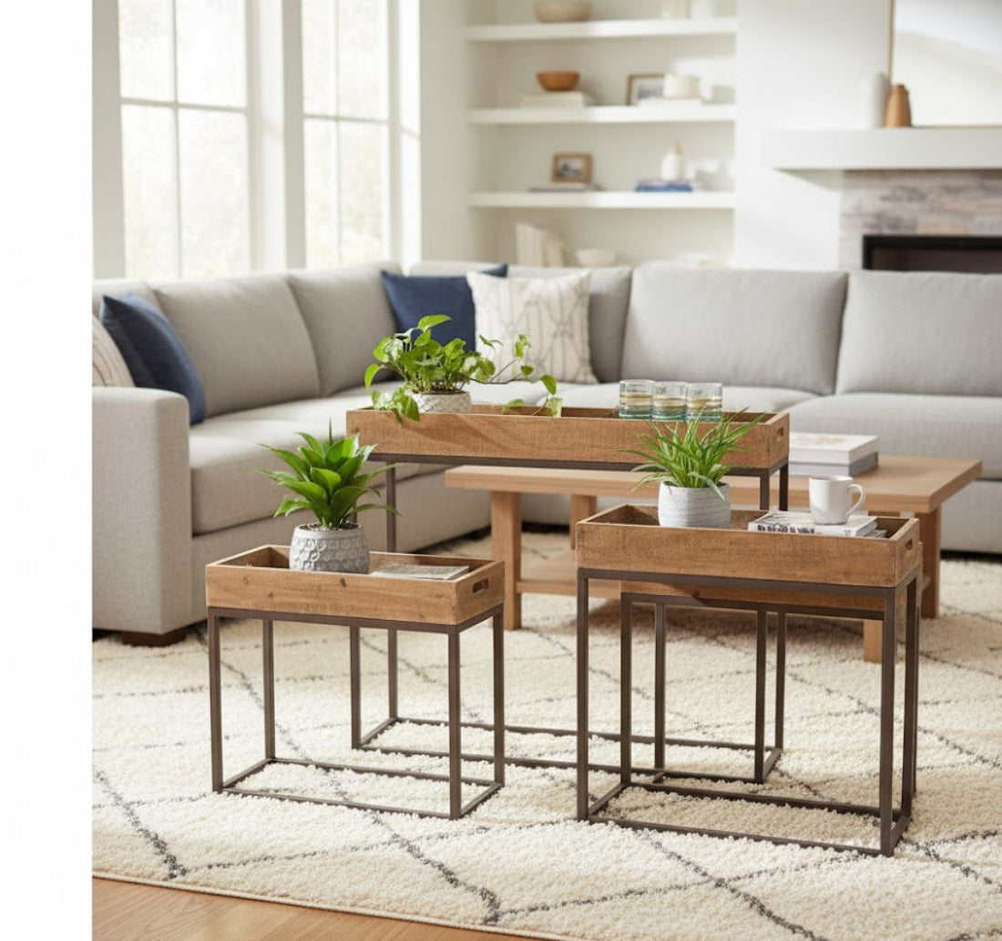 This set of three rustic recycled wood console trays on metal bases combines sustainability and functionality with timeless charm. Each tray features a reclaimed wood surface with a stained finish, supported by a sturdy gray metal base. Use them individually as accent tables or tiered together to create a layered display. Perfect for entryways, living rooms, or retail styling, these handcrafted pieces bring rustic sophistication to any space.