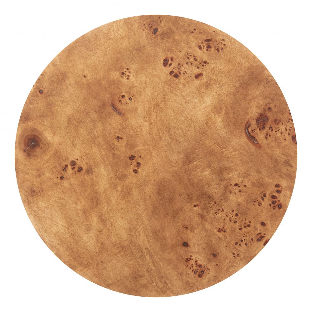 - Burl veneer MDF round tabletop with rich woodgrain pattern