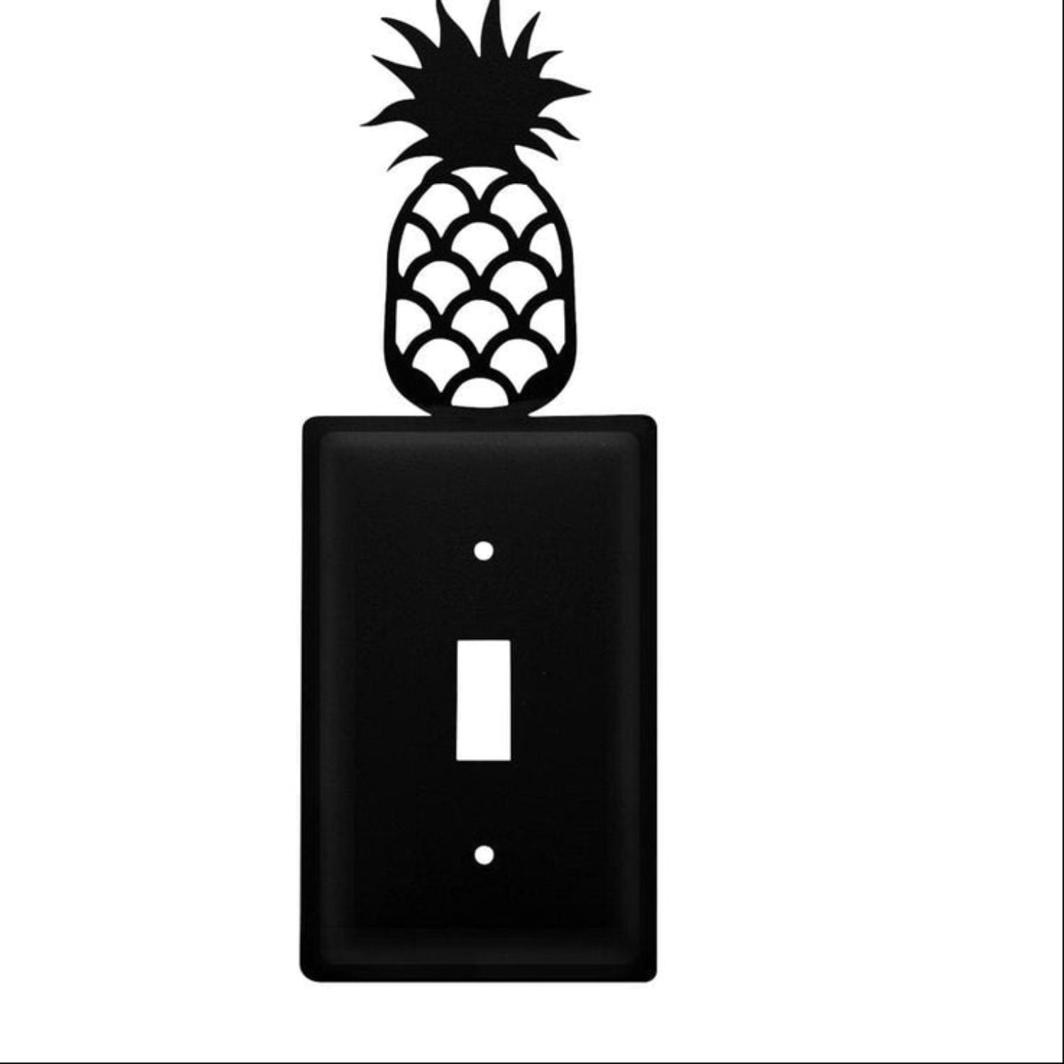 This single pineapple single switch cover is crafted from durable wrought iron and designed to replace standard wall switch plates. The pineapple silhouette adds decorative character while providing a clean finished look to interior walls. Designed for indoor use, this decorative switch cover fits standard single switch openings and installs easily using existing hardware. The metal surface is easy to clean and built for long term use. Ideal for kitchens, living rooms, coastal homes, or tropical themed interiors, it blends functional wall hardware with distinctive visual appeal. Approximate dimensions are 2.75 In width, 8 In height, and 0.17 In depth.