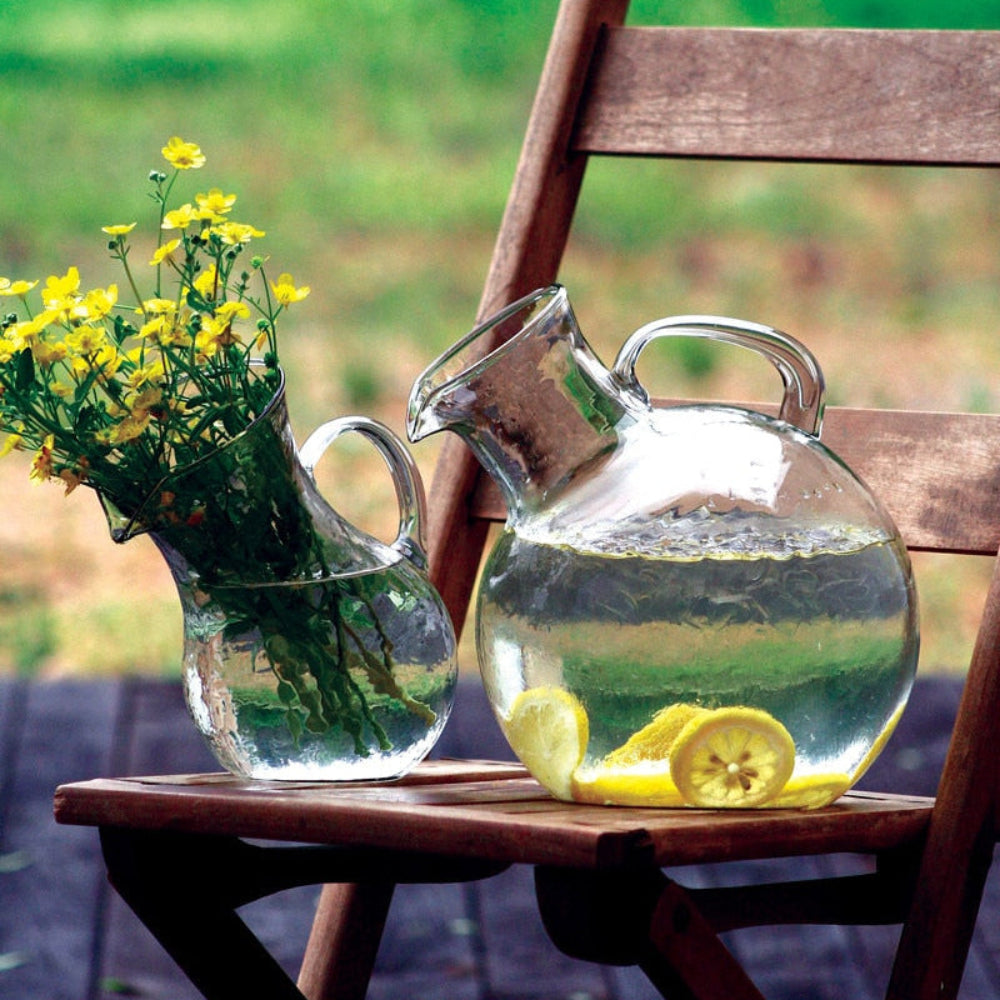 - Hand-blown pitchers crafted from recycled Colombian glass