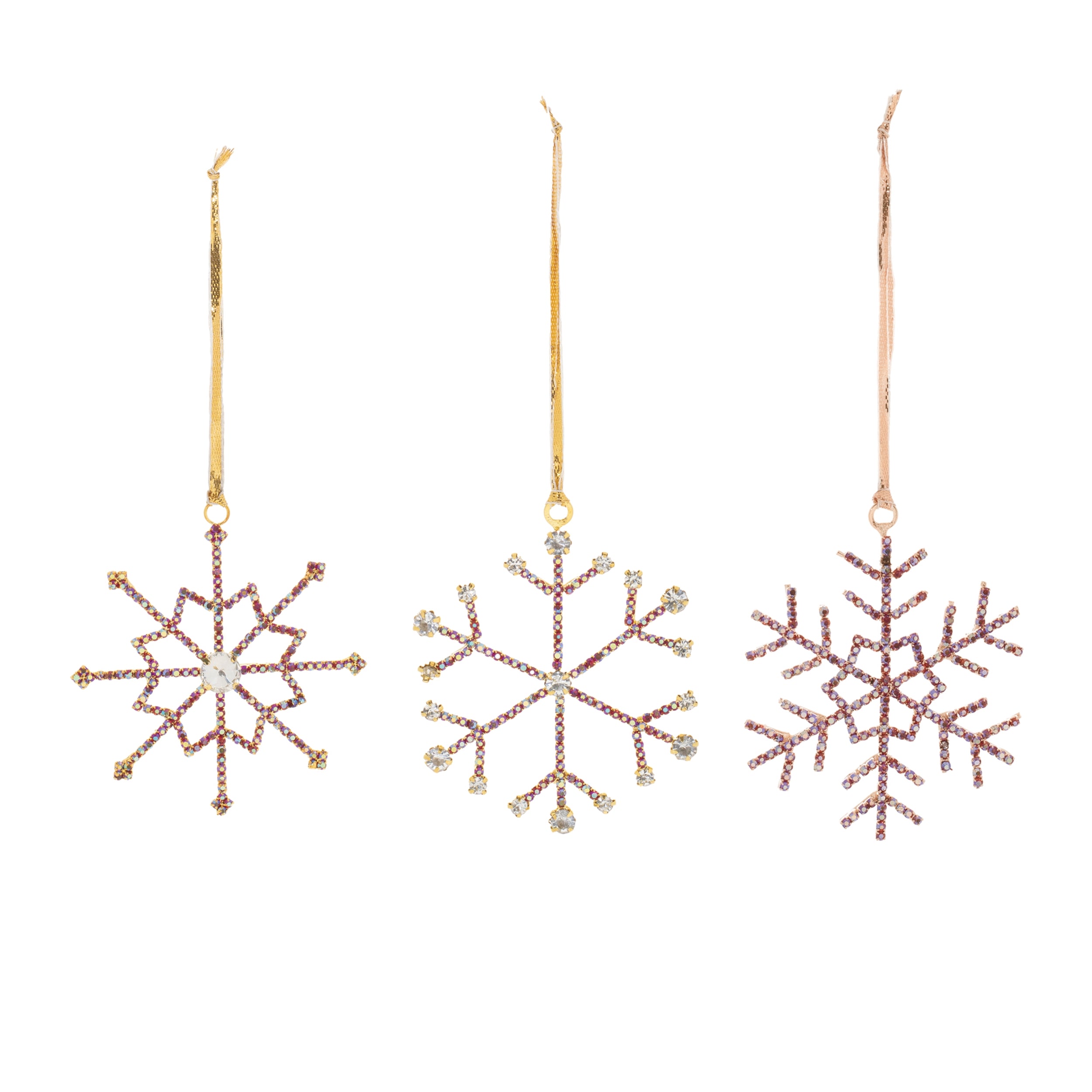 These snowflake Christmas ornaments feature a metal snowflake design enhanced with decorative glass beads for added shine and dimension. Crafted from iron and glass, each ornament measures approximately 3.5 inches high and showcases festive red and gold tones that complement traditional holiday décor. Designed for easy hanging, each piece includes a delicate metallic string loop for quick placement on Christmas trees, wreaths, or garlands. Sold as a set of 12 with three assorted snowflake designs, this collection makes it simple to create a coordinated and polished holiday display throughout your home or to share as a seasonal gift.