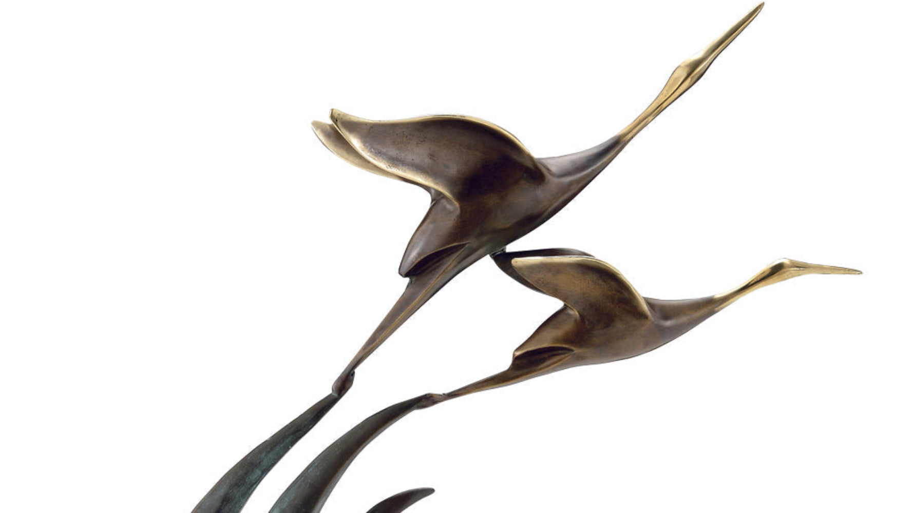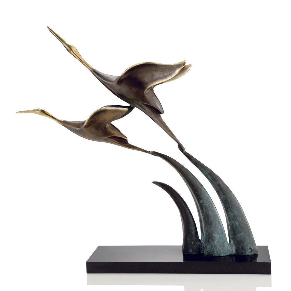 • Elegant cranes captured mid-flight in detailed bronze.
