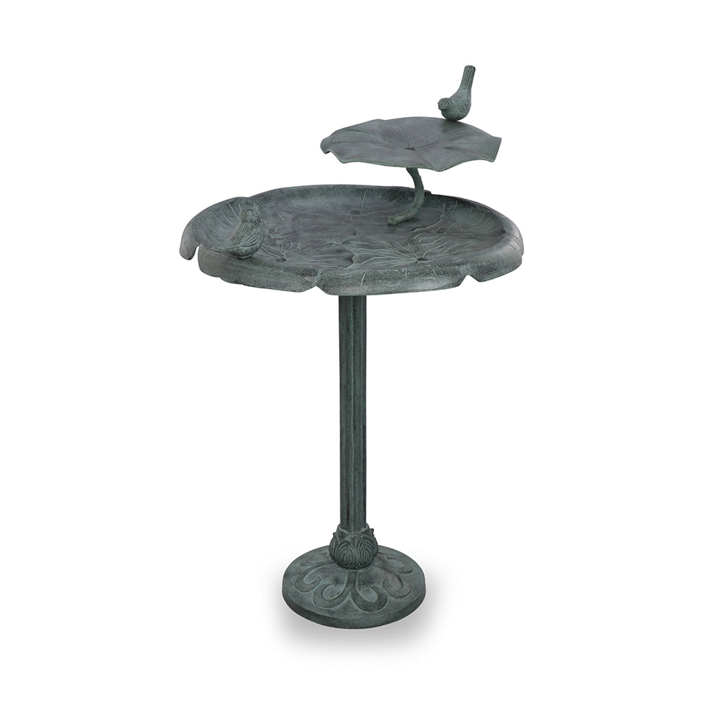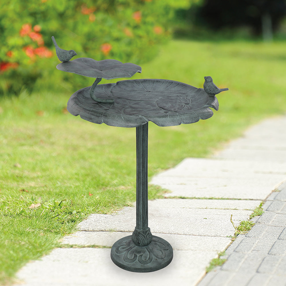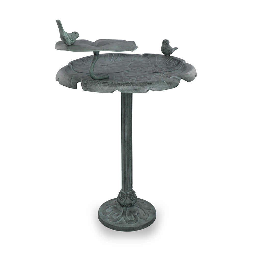 Bring serene beauty and functionality to your garden with the SPI Home Bird Chat on Lotus Birdbath and Birdfeeder. Elegantly sculpted from cast aluminum, this 24-inch-tall outdoor accent features a wide lotus leaf basin adorned with a charming pair of sculpted birds, seemingly mid-conversation. With its generous 32-inch width and 22-inch depth, the basin provides ample space for water or feed, inviting feathered visitors to bathe, perch, and snack. Its nature-inspired form doubles as a striking decorative sculpture, blending perfectly into garden, patio, or balcony settings with coastal or botanical themes.