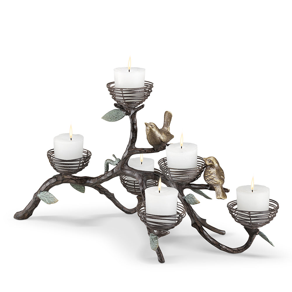 SKU - SPI35170Birds and Nests Candelabra – Sculpted Cast Aluminum Candleholder, 23" Wide Nature Accent