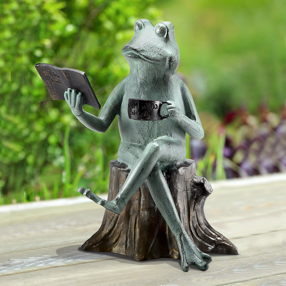 - Adds a peaceful, reflective tone to outdoor areas with its book-loving character