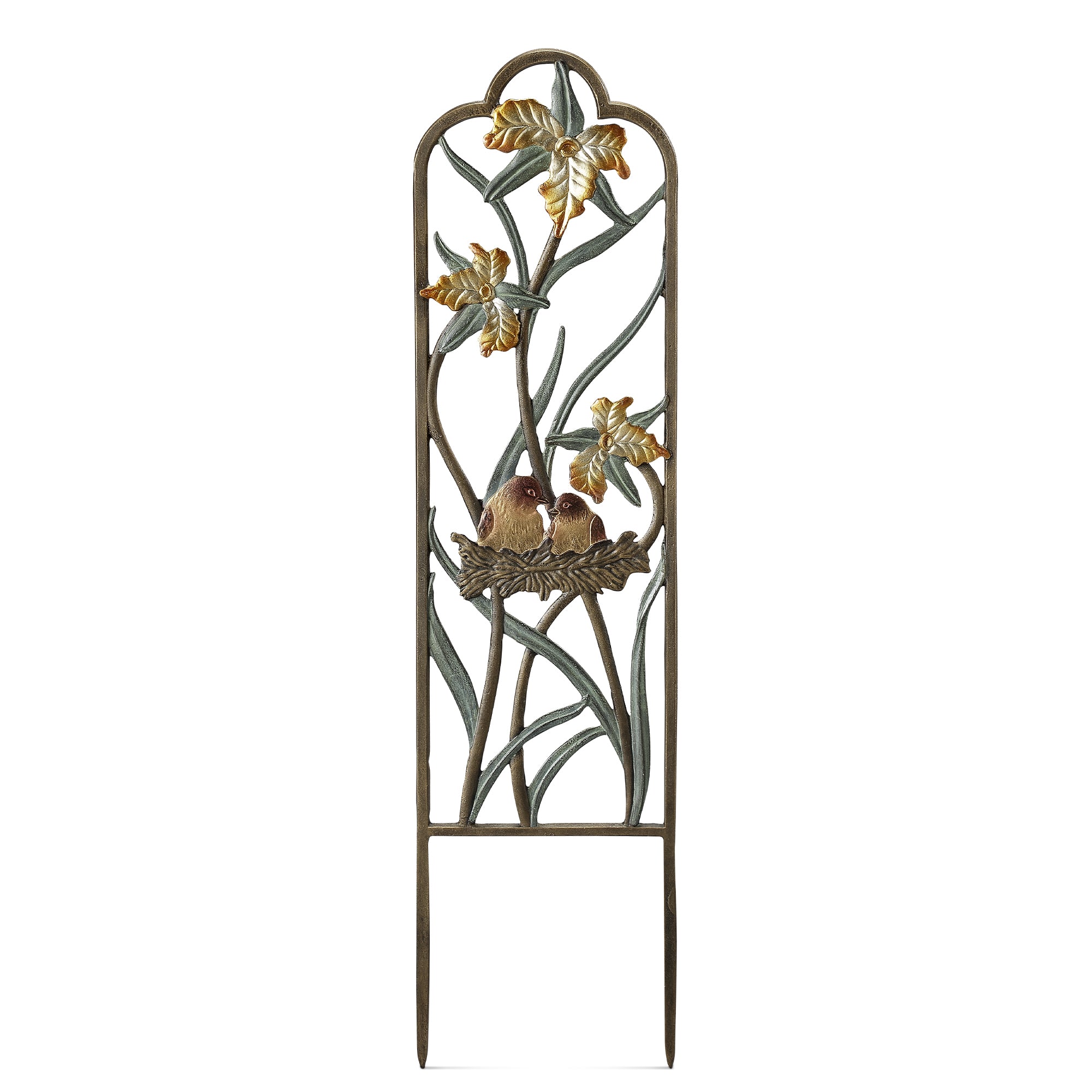 Celebrate nature and affection in your garden with the SPI Home Narrow Lovebirds in Nest Trellis. Standing 33 inches tall and crafted from durable aluminum, this romantic garden accent features a pair of intricately sculpted lovebirds nestled in a cozy branch design. With a compact 8.5-inch width and 0.5-inch depth, it fits beautifully in tighter outdoor spaces or planters. The integrated 7.75-inch ground spikes make installation a breeze while ensuring stability. Ideal for climbing plants or as a standalone decorative element, this trellis adds a gentle, heartfelt touch to any garden or walkway.