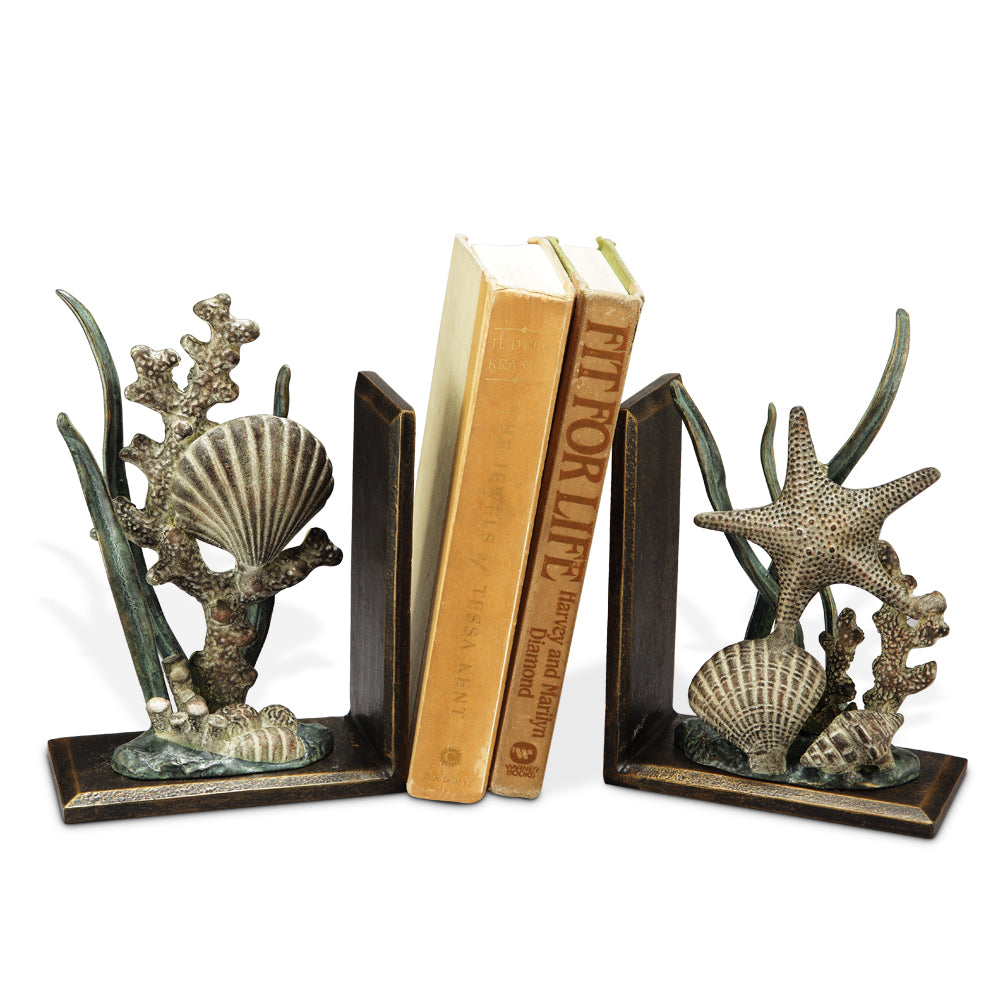 SPI Home Shell Bookends – Coastal-Themed 8.5" Cast Aluminum Book Holder Pair, Heavyweight Nautical Decor for Beach House or Office Shelf