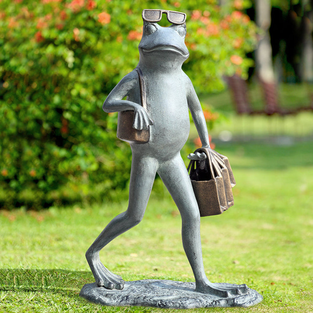 - Decorative frog garden sculpture with stylish “shopper” pose