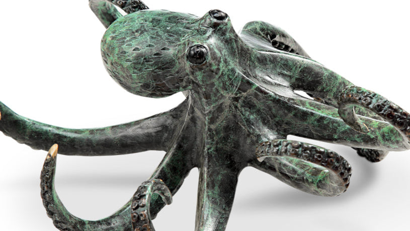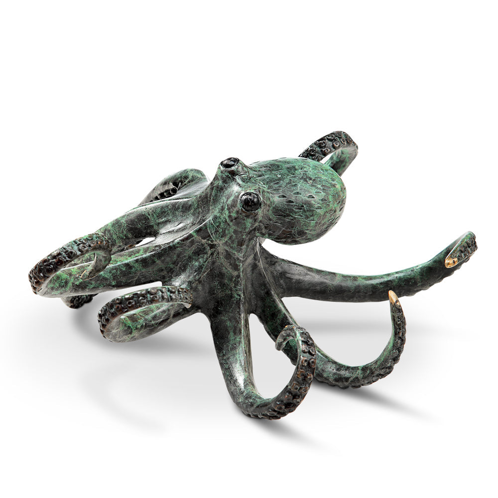 Celebrate the playful spirit of the sea with the Swimming Octopus sculpture by SPI Home. Cast in solid brass and finished to evoke the shimmer of underwater light, this dynamic piece features an octopus in mid-swim, tentacles gracefully curling behind it. Standing just 3.5 inches tall (with a 7.5″ width and 6.5″ depth), it’s perfectly sized for desktops, shelves, or accent nooks. Whether displayed alone or among other marine-inspired décor, its compact form brings a touch of ocean whimsy and tactile elegance to any coastal, nautical, or tropical setting.