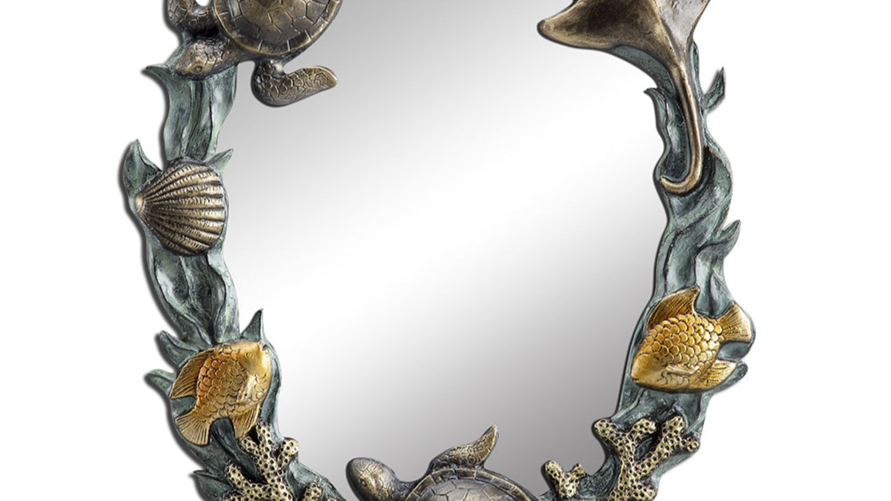 Celebrate coastal charm with the SPI Home Turtles and Sealife Wall Mirror, a beautifully crafted accent that brings the serene beauty of the ocean indoors. Framed in intricately sculpted metal, this mirror features a delightful underwater scene with turtles, starfish, and coral motifs in flowing, organic detail. Designed for both form and function, it adds depth and nautical personality to your space. Measuring 19.5 inches high by 16 inches wide with a 2-inch depth, this wall mirror makes a captivating statement in bathrooms, entryways, or beach-themed interiors. Hang it vertically for a striking focal point that reflects seaside tranquility.